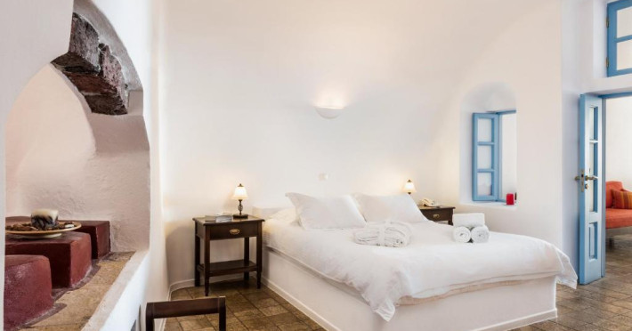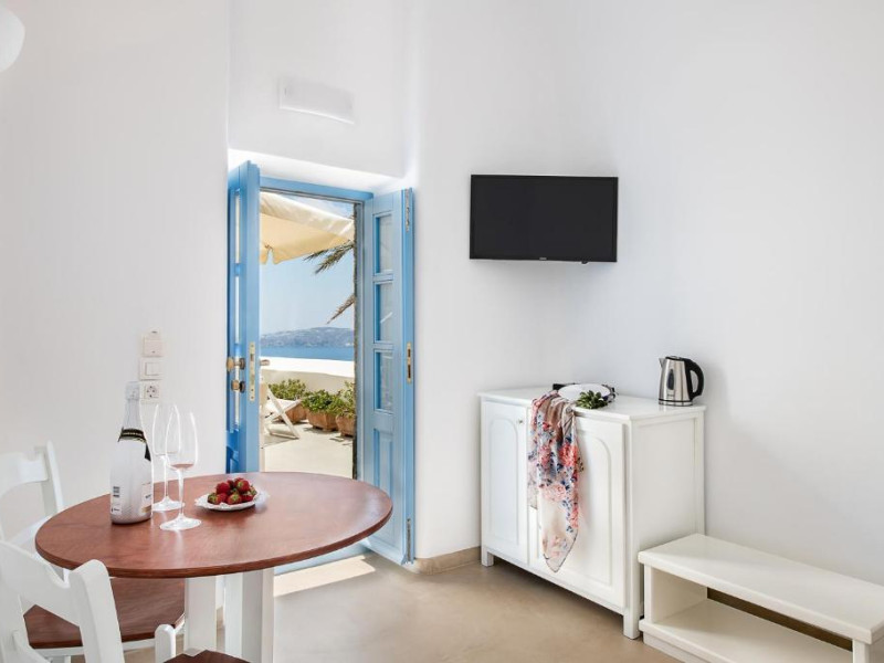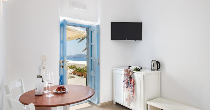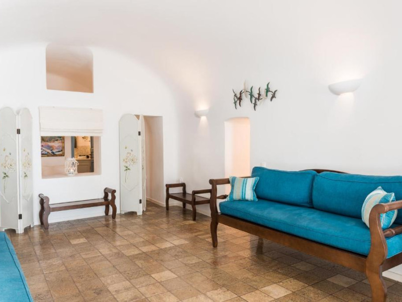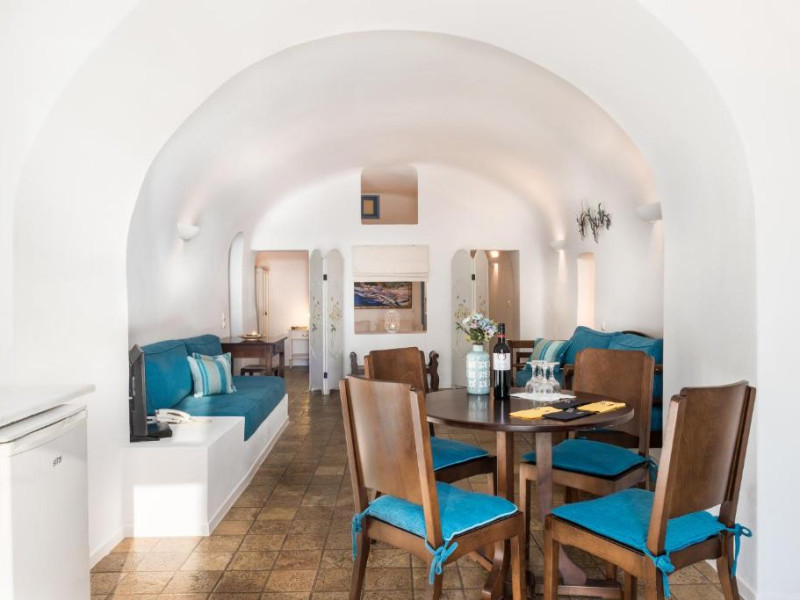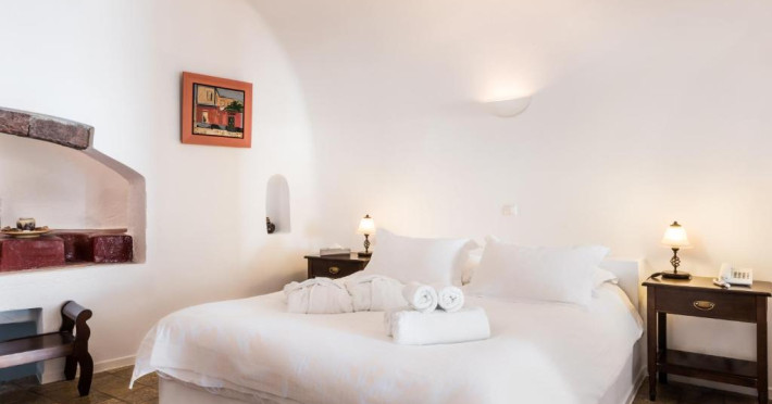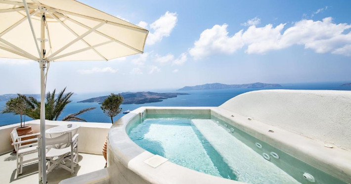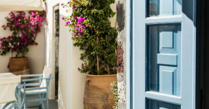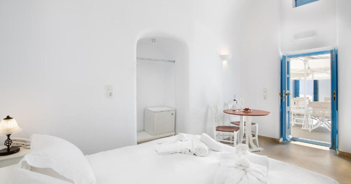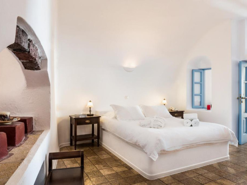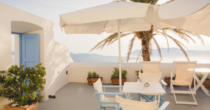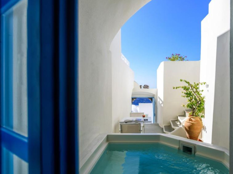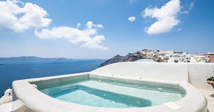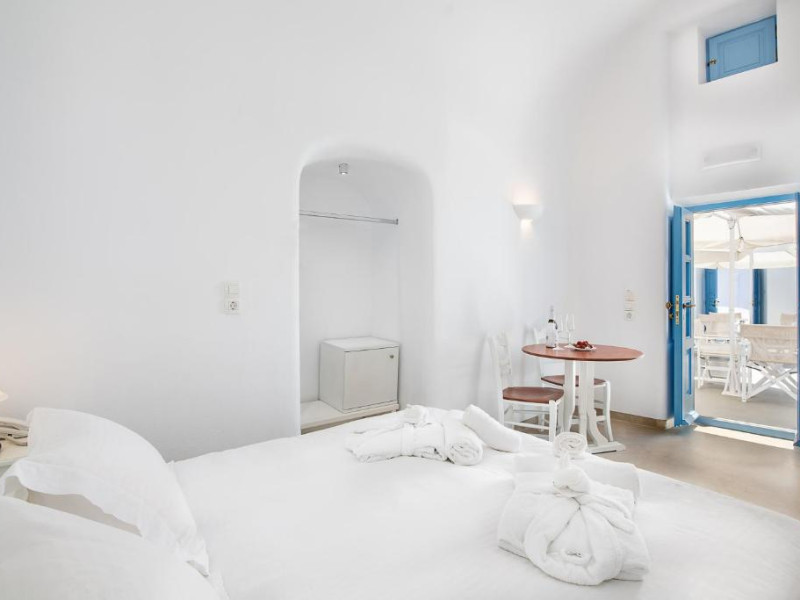 Hotelul este situat in Fira, capitala insulei, pe stancile calderei, cu vedere superbă la vulcan și faimoasele apusuri de soare din Santorini.