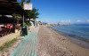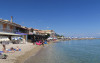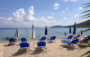 Pe plajă există șezlonguri și umbrele de plajă.
