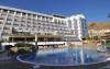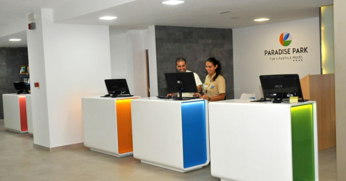 Around 1,5 km from a beach is located the aparthotel Paradise Park Fun Lifestyle Hotel. The hotel is equipped with a 24h reception, Wi-Fi, 10 lifts, a hairdresser, a jacuzzi, parking spaces as well as a TV lounge. In the outdoor area of the property you will find a heated pool (open all year), where sun loungers are available for free. For children there is also a children's pool. Furthermore, outside you can find a sun terrace. Inside the hotel you can use an indoor pool. You can store your luggage in the hotel's storage room. There is also a laundry service. If necessary, you can contact the medical centre. For conventions and other business meetings, the hotel offers a conference area. If you want to explore the holiday region, you can use the car rental service close to the hotel (extra fee). Due to its barrier-free facilities the hotel is also suitable for wheelchair users. Catering As catering services the hotel offers all-inclusive. Breakfast is offered from the buffet. Lunch and dinner are also served à la carte or from the buffet. For the meals, there are a buffet restaurant and 2 bars as well as the pool bar. The drinks menu of the hotel includes water, soft drinks, coffee and tea and beer. Appropriate clothing is required for lunch and dinner. Distances