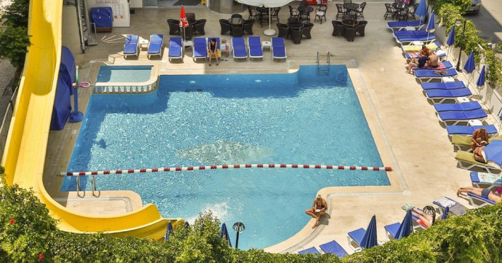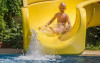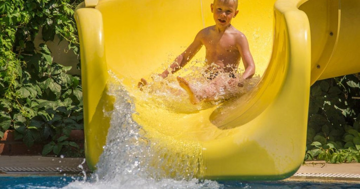 Copiii se pot distra la piscina special amenajată, prevăzută cu tobogane cu apă.