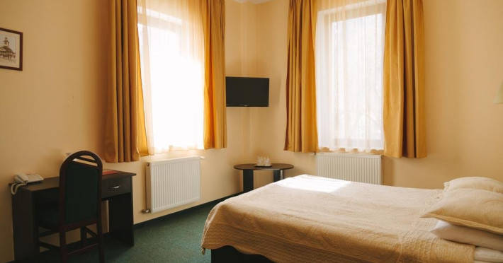 Camere: Hotelul dispune de 14 camere duble, 2 suite (compuse din: 1 camera dubla, 1 camera single, baie si hol) de 3 locuri; camerele sunt dotate cu bai proprii, minibar, Tv cablu, internet gratuit, telefon cu acces national si international, sonorizare ambientala.
