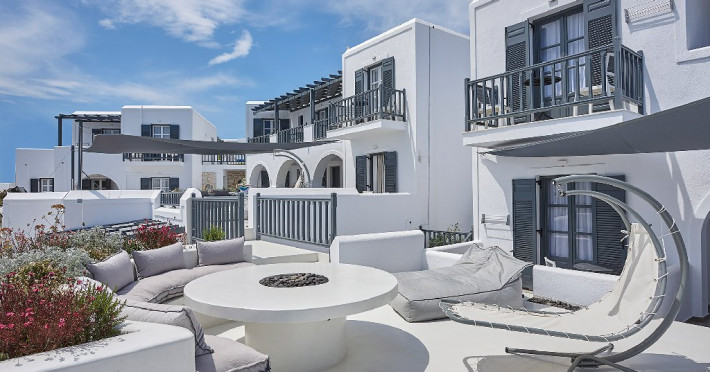 Hotelul este situat in Naoussa, in partea nordica a insulei Paros, la numai 40 de metri de plaja cu nisip, Saint Anargiri, si la 10 minute de mers de centru orasului Naoussa. La 600 m se afla statia unde opresc autobuze care duc in majoritatea locurilor importante din insula.