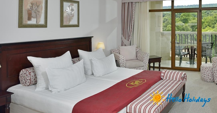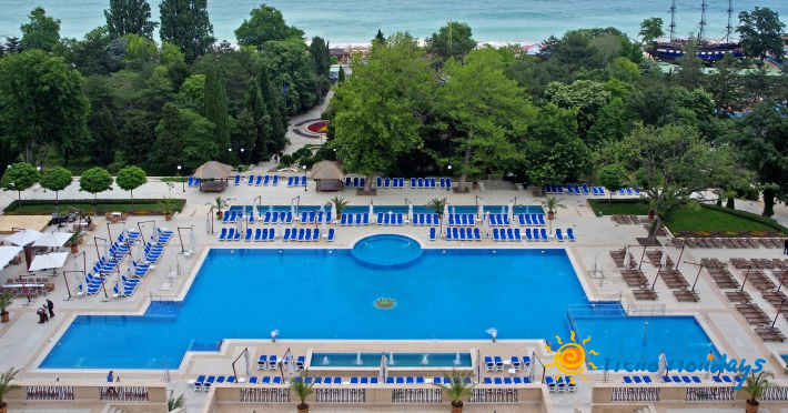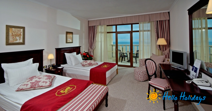 Proprietatea luxoasă Melia Grand Hermitage este situată într-o zonă liniștită pe versantul unui deal, la numai 100 m de plajă și la mică distanță de centrul stațiunii Nisipurile de Aur. Toate camerele au un balcon privat spaţios, cu vedere superbă la mare, la piscină, la parcurile din jur sau la dealurile împădurite.