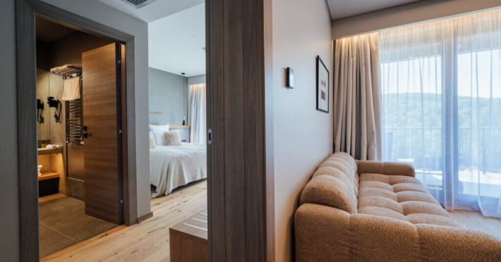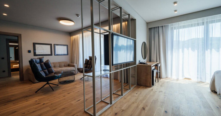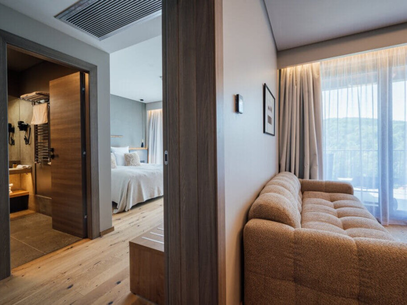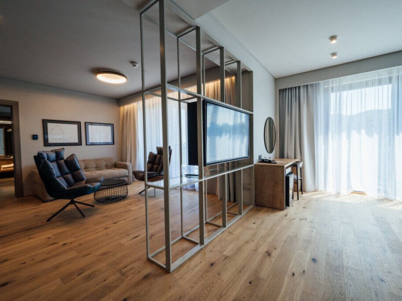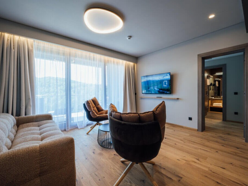 Presidential Suite Vedere la padure cu 1 Dormitor, Livingsi Balcon - Apartament presidential cu vedere spre padure cu o suprafata totala de 70 m2 cu living spatios, 1 dormitor si balcon mare. Este ideala pentru maxim 4 persoane optional cu canapea extensibila in living. Apartamentul este dotat cu aer conditionat, TV cu ecran plat, prin satelit, seif electronic, mini-bar, facilitati de preparare a cafelei si ceaiului in camera, Wi-Fi gratuit, incuietoare electronica la usi. Bai echipate modern, cu dus, uscator de par, oglinda cosmetica, articole de toaleta.