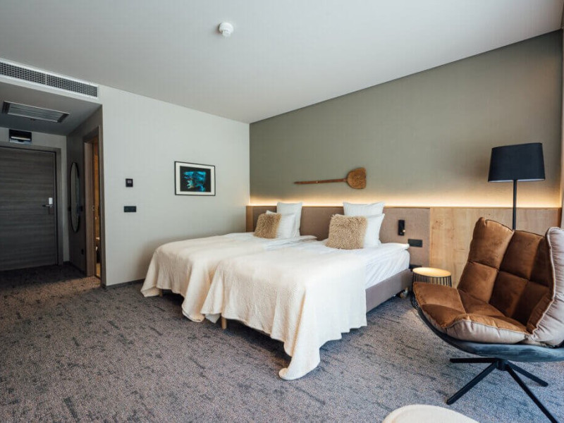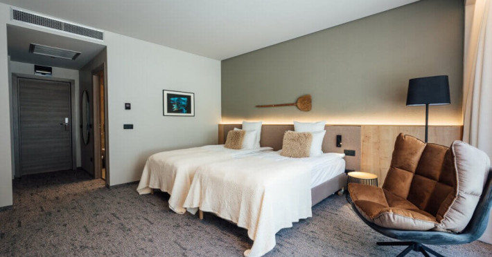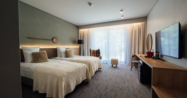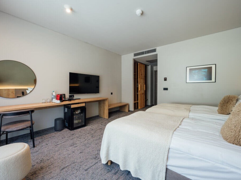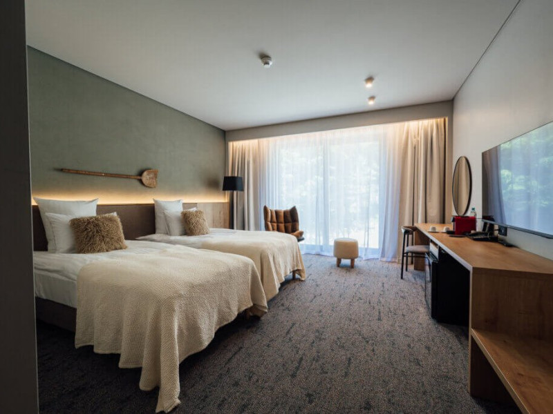 Camera Deluxe cu Vedere la Padure, spatioasa si confortabila, cu o suprafata de 29 m2 are o vedere spectaculoasa spre padure. Sunt ideale pentru una sau doua persoane, optional cu pat suplimentar pentru a 3-a persoana. Camerele sunt dotate cu aer conditionat, TV cu ecran plat, prin satelit, seif electronic, mini-bar, facilitati de preparare a cafelei in camera, Wi-Fi gratuit, incuietoare electronica la usi. Bai echipate modern, cu dus, uscator de par, oglinda cosmetica, articole de toaleta pentru oaspeti, prosoape pufoase. Nu au balcon.