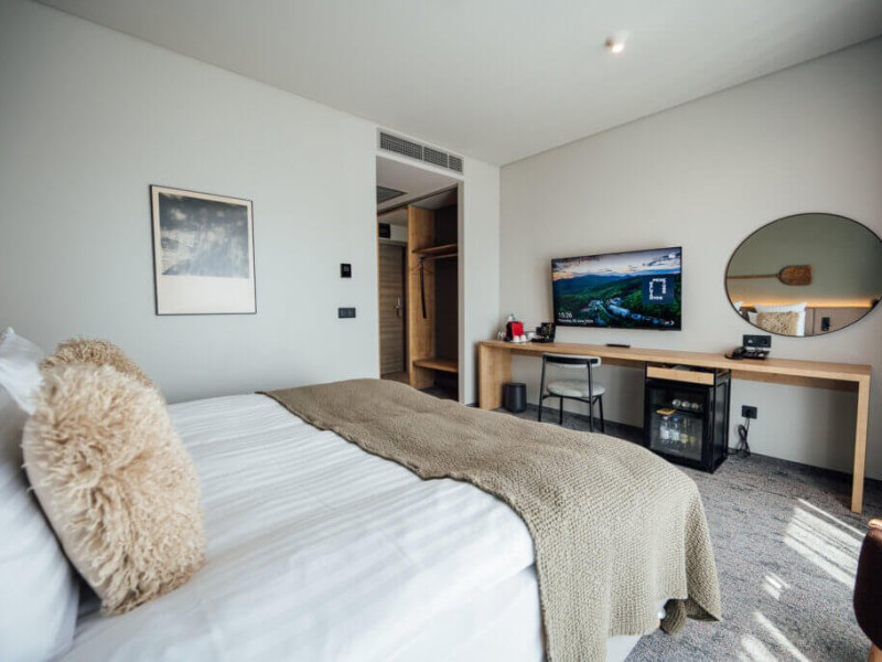 Camera Deluxe - Vedere Panoramica, spatioasa, avand o suprafata de 24 m2 cu vedere panoramica spre muntii inconjuratori. Sunt ideale pentru una sau doua persoane. Camerele sunt dotate cu aer conditionat, TV cu ecran plat, prin satelit, seif electronic, mini-bar, facilitati de preparare a cafelei in camera, Wi-Fi gratuit, incuietoare electronica la usi. Bai echipate modern, cu dus, uscator de par, oglinda cosmetica, articole de toaleta pentru oaspeti, prosoape pufoase. Nu au bacon.