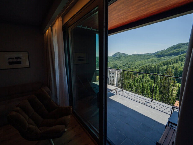 Oaspetii pot alege intre camere cu vedere panoramica impresionanta asupra muntilor si camere cu vedere linistitoare catre padure.