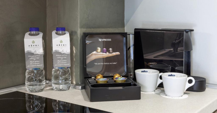 Pefki Deluxe Residence servește zilnic un mic dejun tip bufet în zona de luat masa. La proprietate există un bar care oferă cafea și diverse băuturi. Acestea pot fi servite atât în interior, cît si în aer liber, pe terasă, în funcție de vreme. Oaspeţii îşi pot pregăti micul dejun şi alte mese şi le pot savura chiar pe balcon.