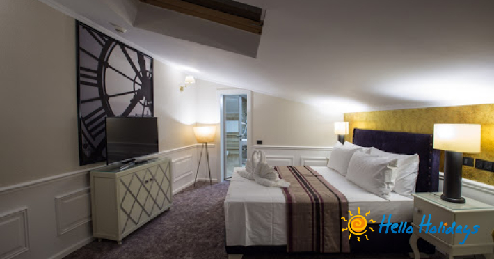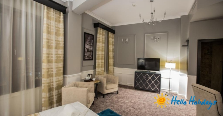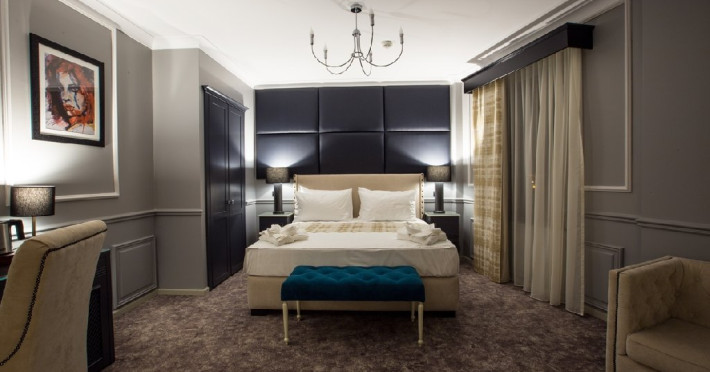 DELUXE KING ROOM - Camerele Deluxe sunt o expresie a luxului, materializata in elemente de design atent alese si finisaje care vor transpune in realitate experienta suprema a confortului si elegantei.Fiecare camera dispune de canapea extensibila fiind echipata cu aer conditionat centralizat, internet wi-fi, Smart TV, minibar, baie private, seif, uscator de par, papuci de interior, halat de baie, draperii black-out 100%. In aceste camere se pot caza 2 adulti si maxim un copil cu varsta cuprinsa intre 0-5.99 ani iar canapeua extensibila poate acomoda 1 adult + 1 copil cu varsta maxima de 5.99 ani sau 2 copii cu vartsa maxima de 5.99 ani. Suprafata totala a camerei este de 28 mp