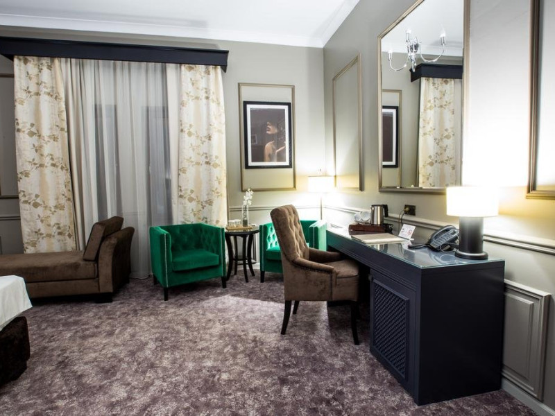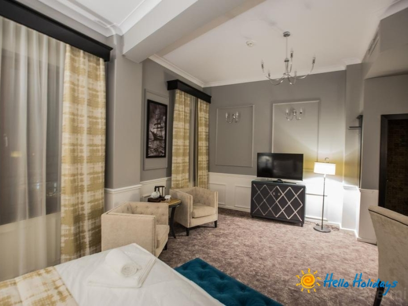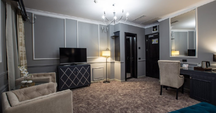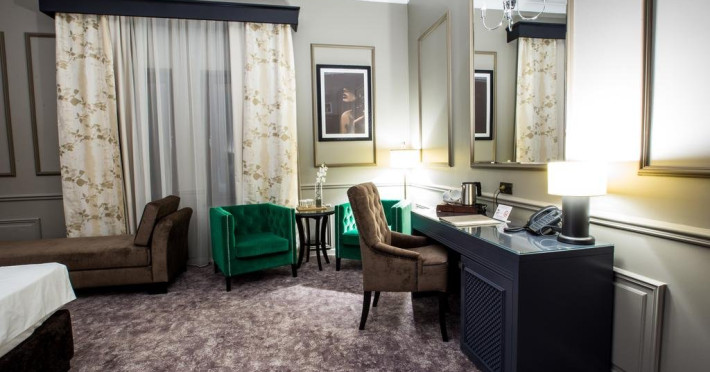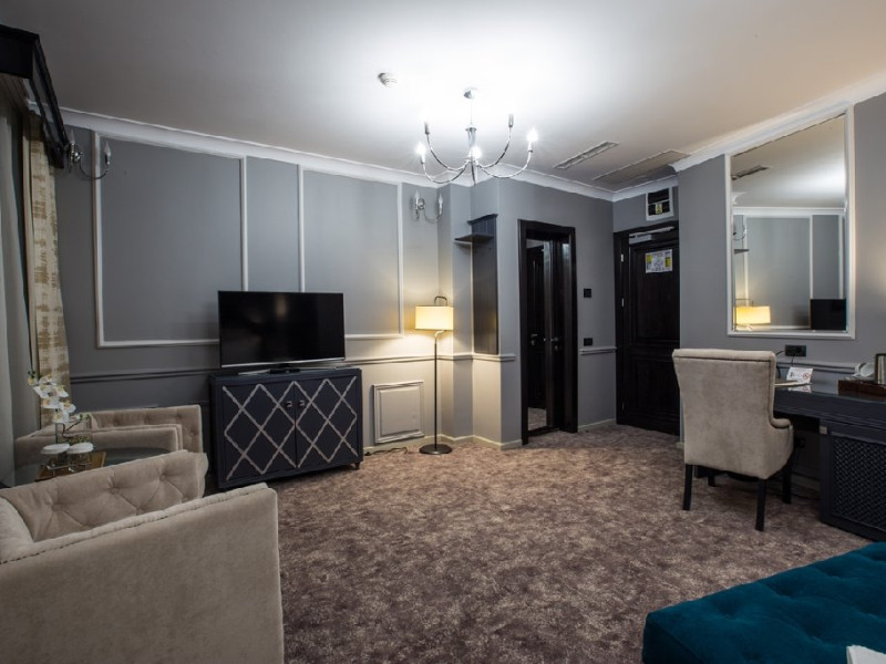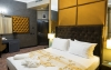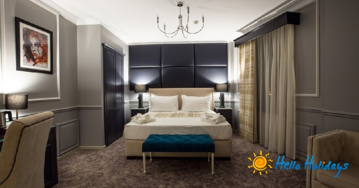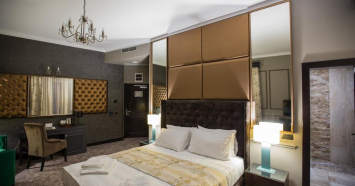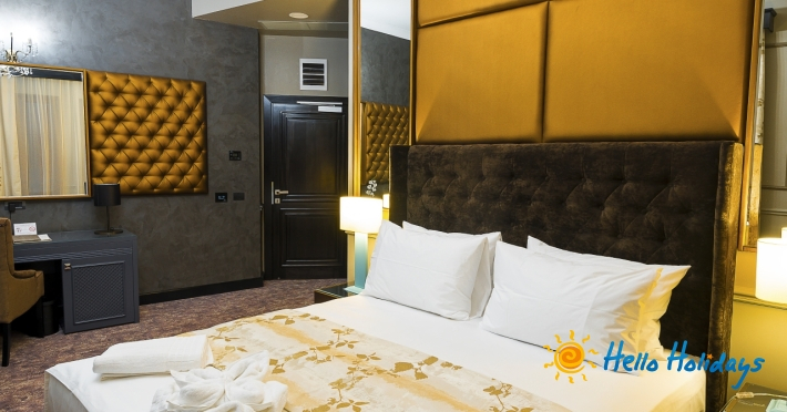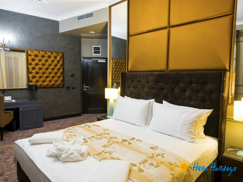 DELUXE DOUBLE ROOM - Spatiile generoase ale camerelor duble sunt decorate si accesorizate cu elemente care ofera o eleganta distinsa, iar pe voi va introduc intr-o atmosfera confortabila si linistita.In fiecare camera exista aer conditionat centralizat, internet wi-fi, Smart TV, minibar, baie private, seif, uscator de par, papuci de interior, halat de baie, draperii black-out 100%. In aceste camere se pot caza 2 adulti si maxim un copil cu varsta cuprinsa intre 0-5.99 ani. Suprafata totala a camerei este de 28mp.