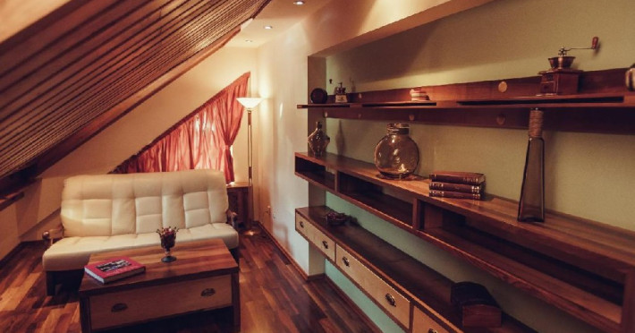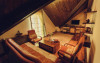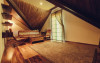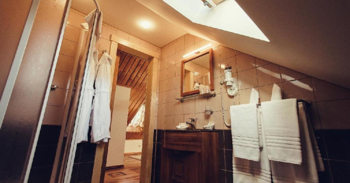 1 x Suita la mansarda: aceeasi capacitate, insa fara usa de delimitare intre dormitor si living, iar baia dispune tot de cabina de dus.