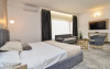 Camera dubla family are in dotare un pat matrimonial (180x200) si o canapea extensibila (1 persoana), LCD tv, minibar, aer conditionat, telefon, internet wireless, baie cu dus, uscator de par, papuci, podele cu mocheta, plase de tantari, balcon propriu. Este amplasata la parter si etajul 1. Suprafata 35 mp.