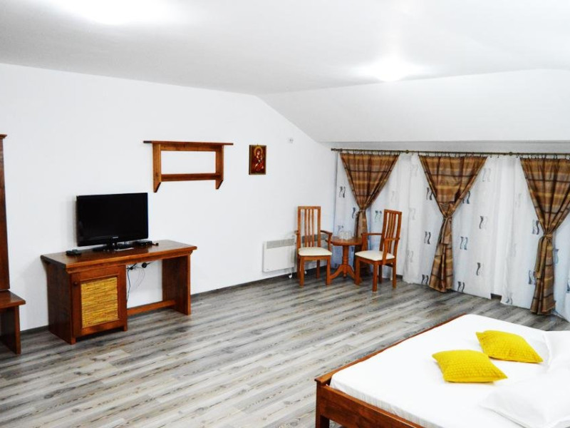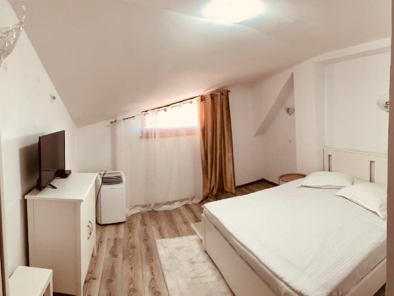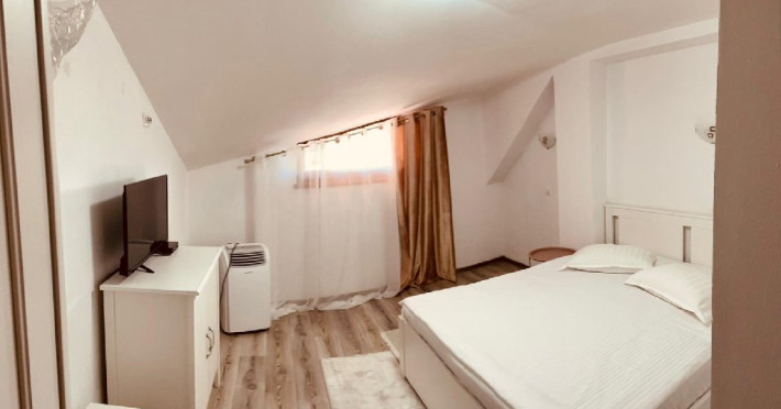 Camera dubla economy situata la mansarda: pat matrimonial, frigider in camera, tv, aer conditionat, wireless
