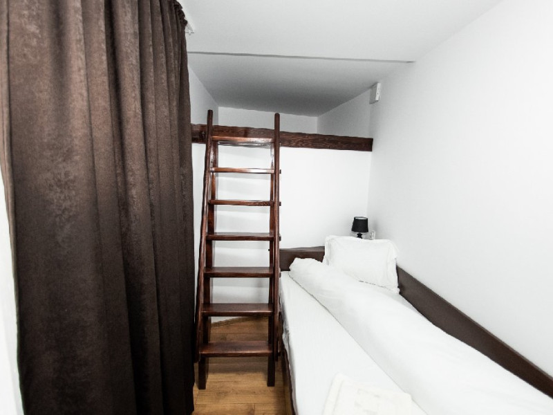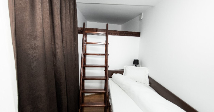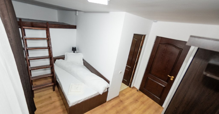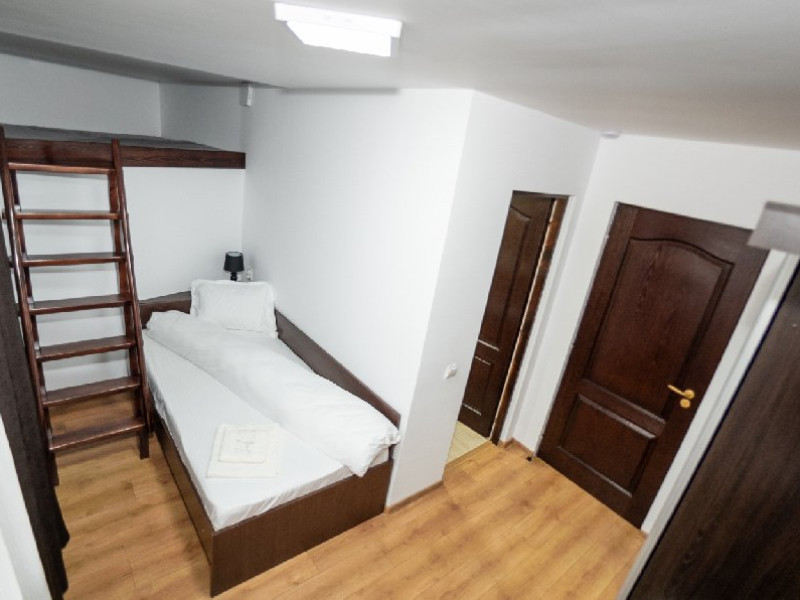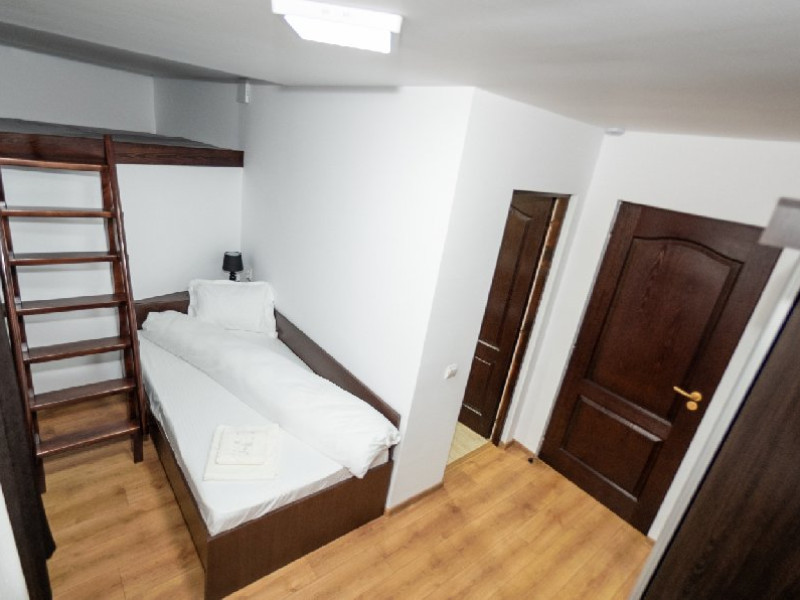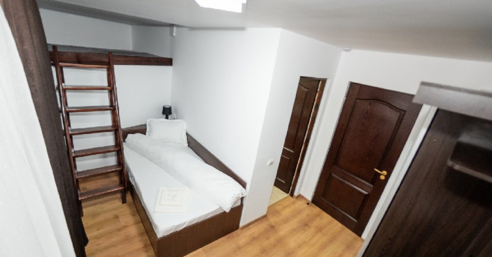 Camera single este gandita pentru o familie monoparentala sau pentru o singura persoana. Camera dispune de un pat single si un pat dublu cu acces pe trepte. O camera ideala pentru copii/tineri.