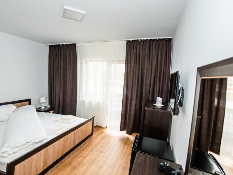Locuri de parcare pentru toata capacitatea pensiunii in incinta proprietatii, proprietatea beneficiaza de restaurant, bar, terasa,loc de joaca, spatiu verde, jacuzzi si sauna. Toate camerele sunt dotate cu minibar(neechipat).