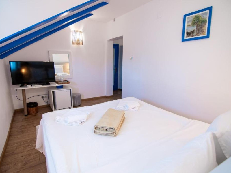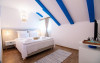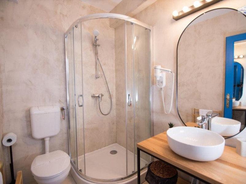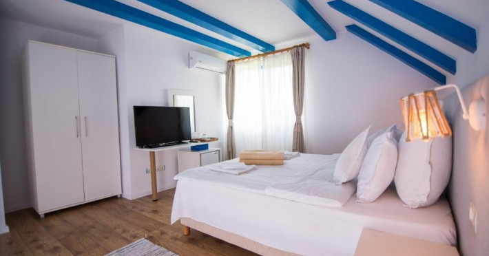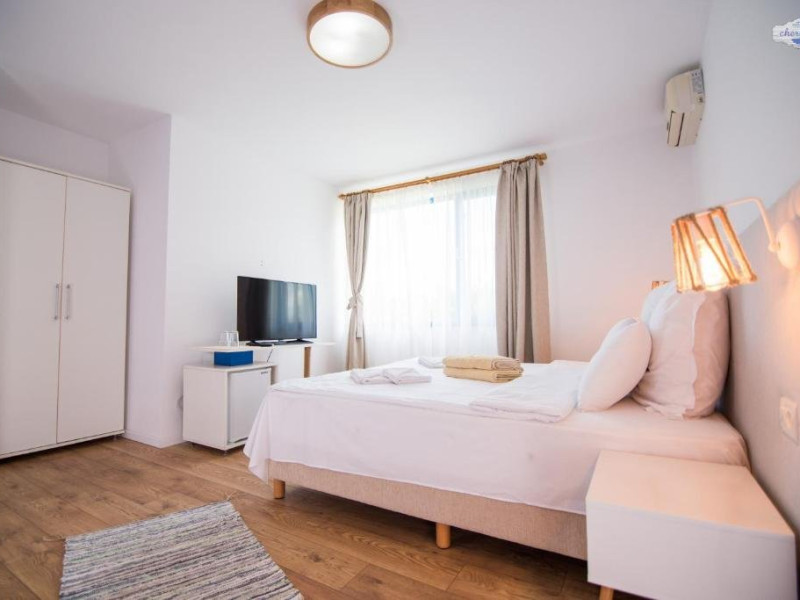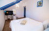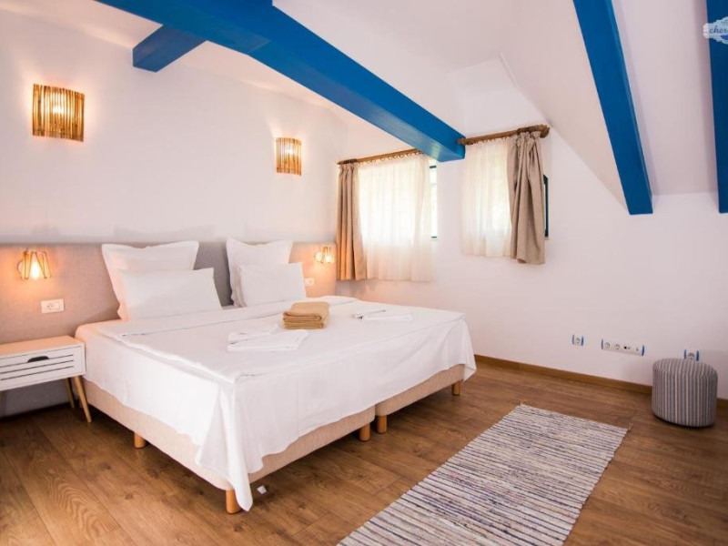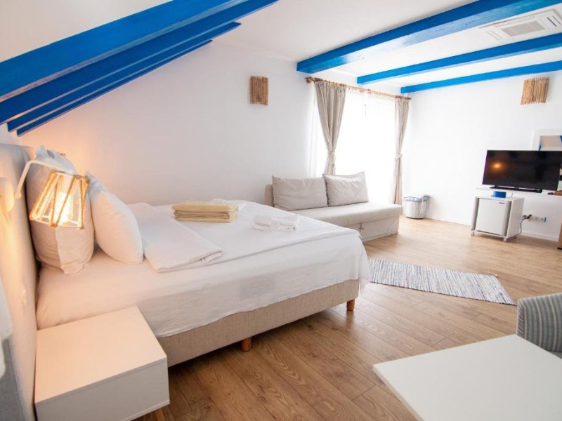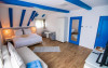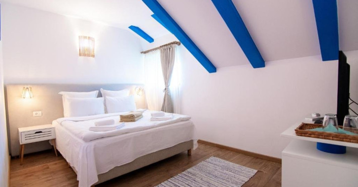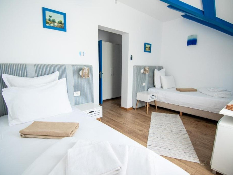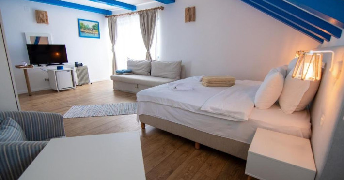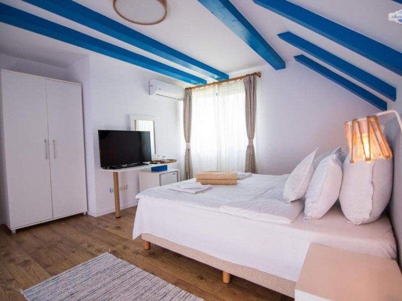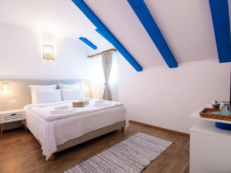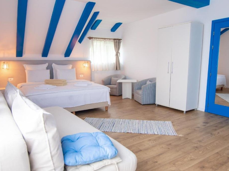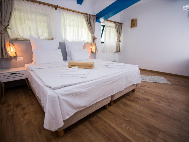 Camera dubla superioara dispune de un pat matrimonial si o canapea extensibila.