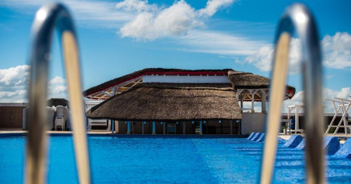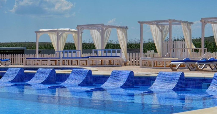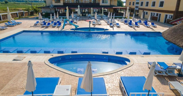 Zona de plaja si relaxare cu 150 de sezlonguri cu umbrele amplasate in jurul piscinei semiolimpice de 300 mp cu apa incalzita, ce dispune de bar si sezlonguri in apa, plus un jacuzzi de relaxare cu sezlonguri si canapele cu hidromasaj si o  piscina pentru copii dotata cu umbrela si tobogan cu apa, langa care este amenajat un amplu si diversificat spatiu de joaca destinat copiilor. Piscina este dotat cu o instalatie de inclzire apei de ultim generatie.