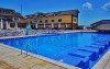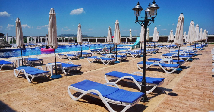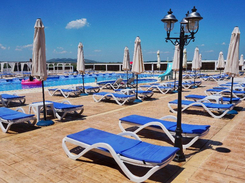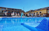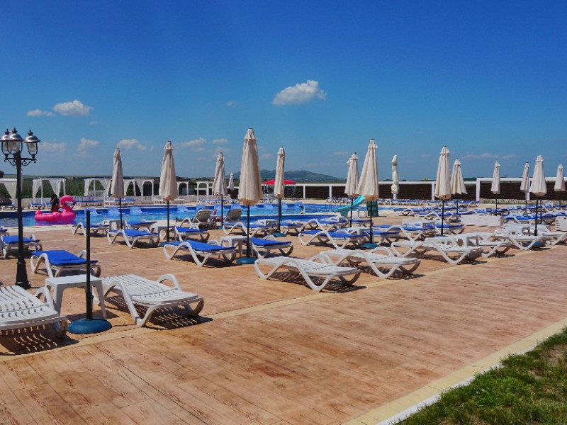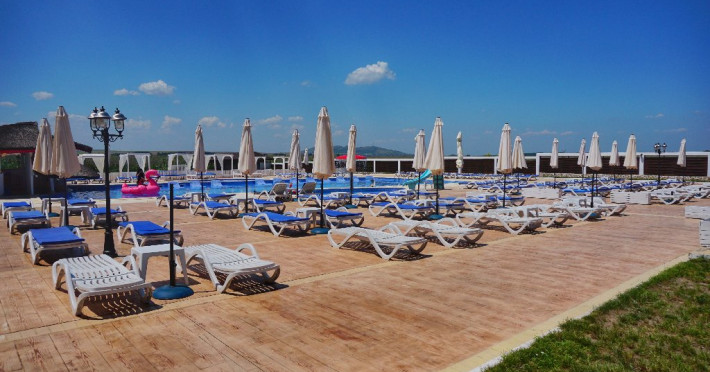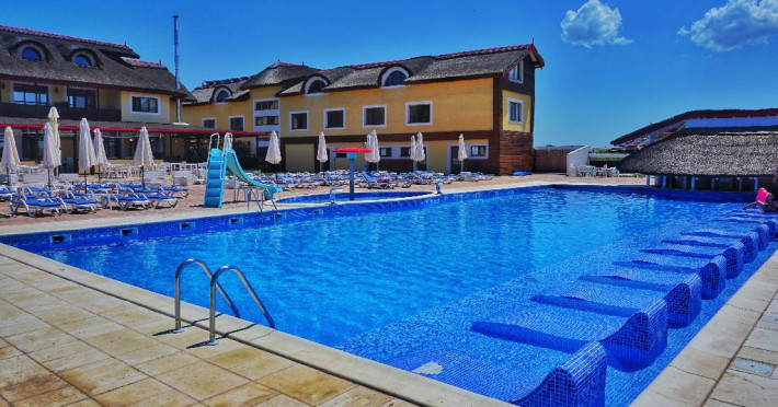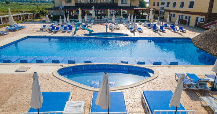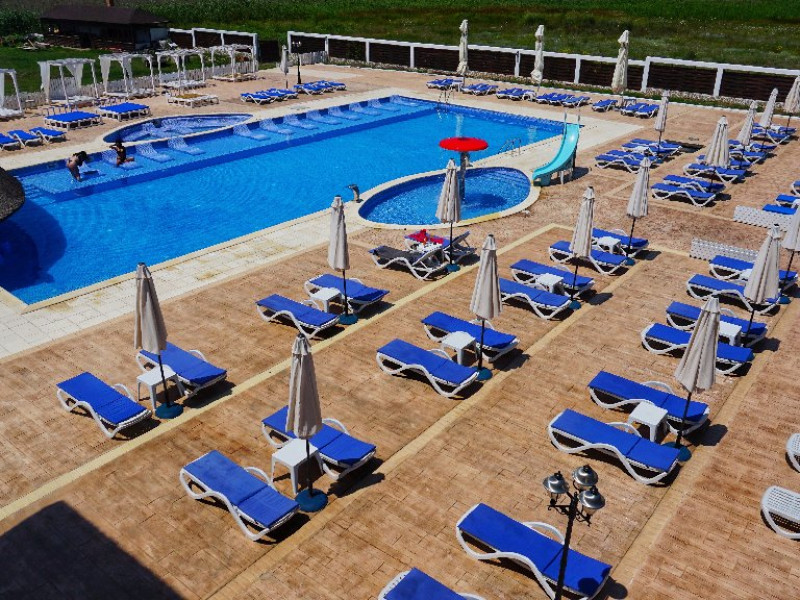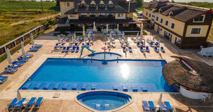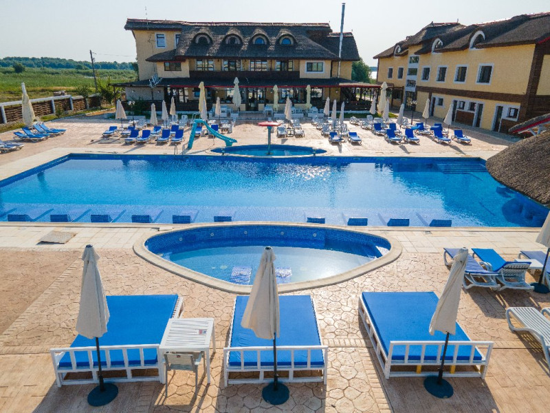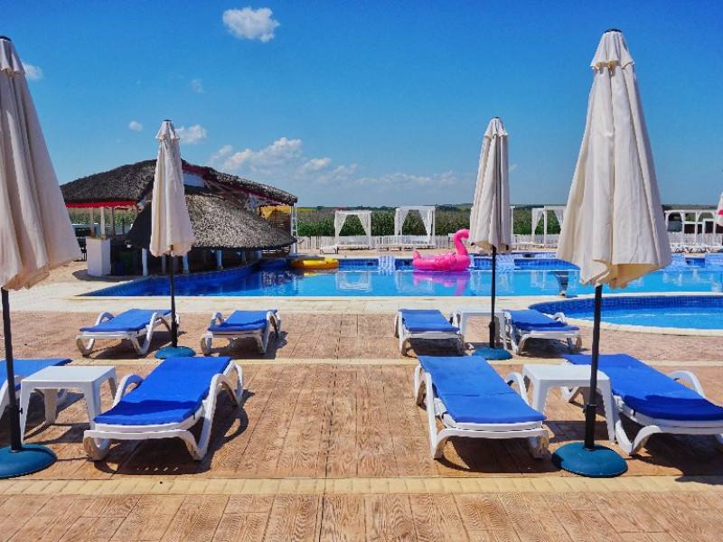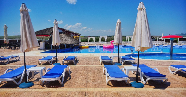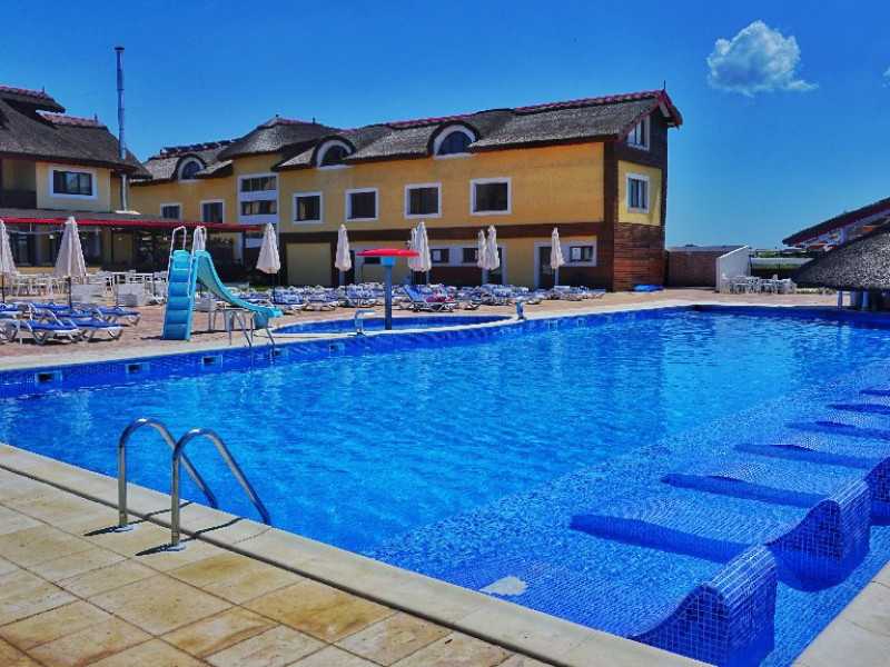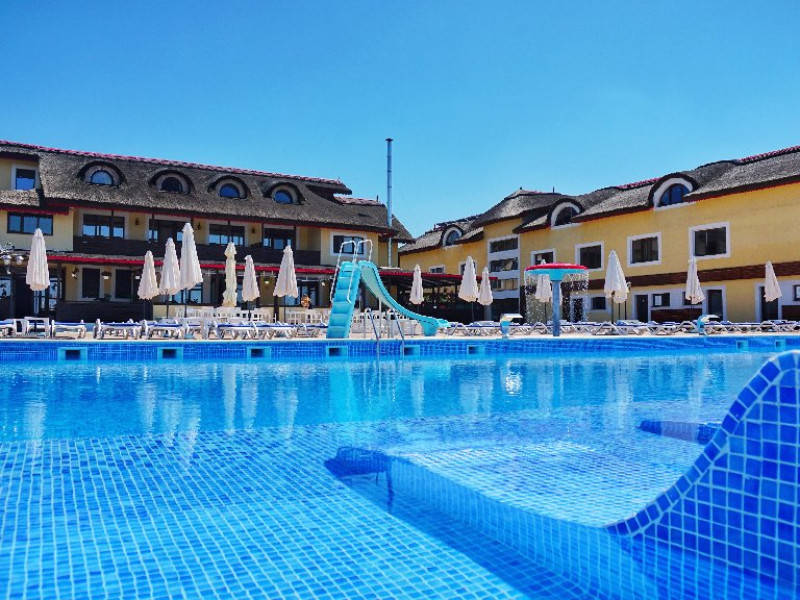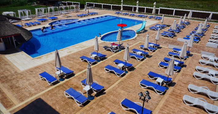 In spatele pensiunii se afla zona de plaja si relaxare cu sezlonguri si umbrele amplasate in jurul piscinei semiolimpice de 300 mp cu apa incalzita, ce dispune de bar si sezlonguri in apa, plus un jacuzzi de relaxare cu sezlonguri si canapele cu hidromasaj si o piscina pentru copii dotata cu umbrela si tobogan cu apa, langa care este amenajat un spatiu de joaca destinat copiilor.