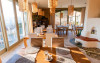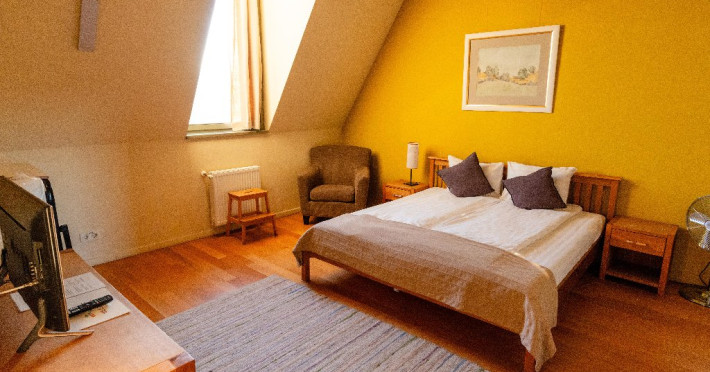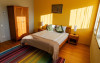 Camera FAMILLY SUITE: pe cei 25 de mp, culoarea galben-mustar da tonul ambientului rafinat. Fotoliul asezat intr-un colt luminos iti ofera o zona de relaxare proprie. Baia este unica, geamul inalt de 2 metri deschizand spatiul catre cer. Dotari: televizor full HD, baie proprie cu dus si uscator de par.