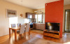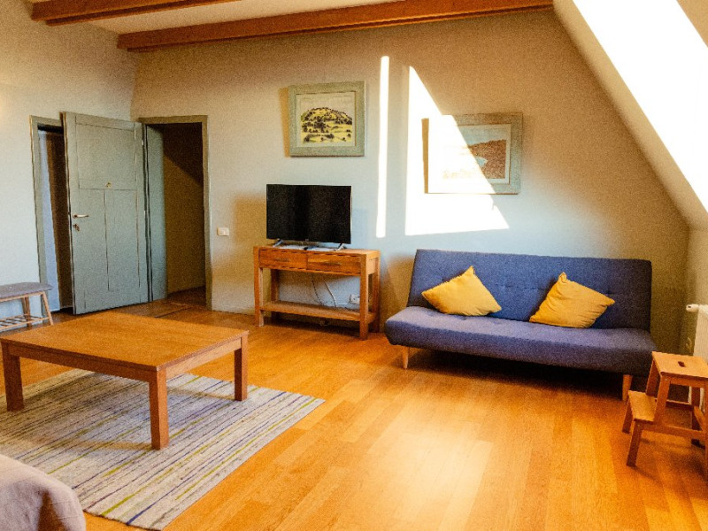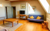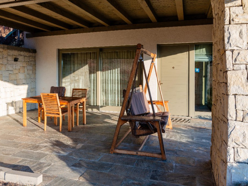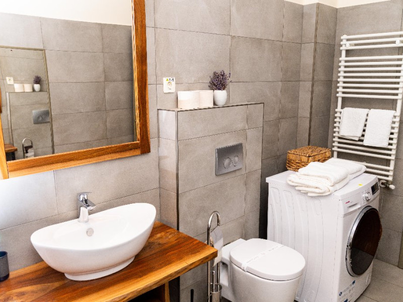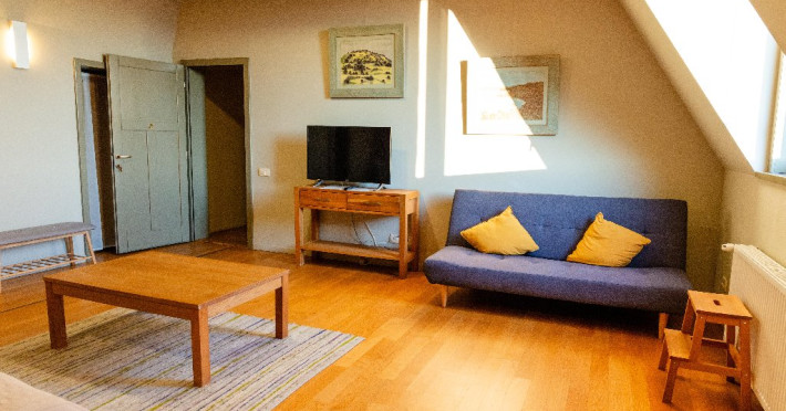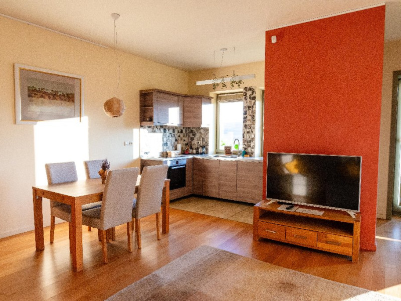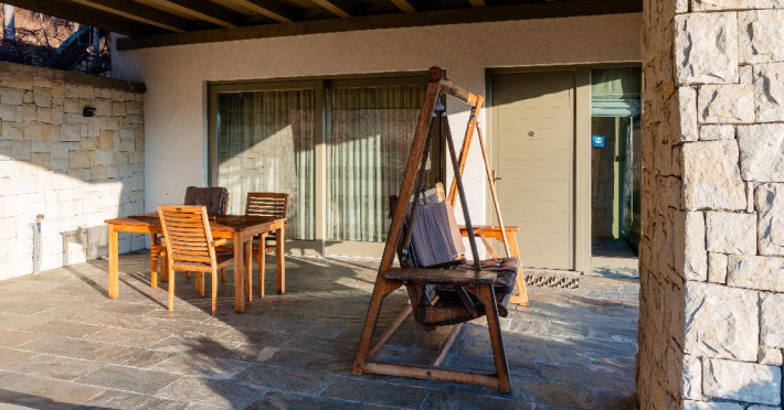 Apartament: este un apartament luminos, cu spatii aerisite. Aici totul este pregatit pentru a te simti acasa! Are un living generos de 35 mp in care este integrata o bucatarie complet echipata. Terasa acoperita de 30 mp este in prelungirea sufrageriei, de care este despartit printr-un perete de sticla cu usa glisanta. Aici te poti bucura de serile inmiresmate si de aerul curat respirat de padurea alaturata. Facilitatile electrocasnice (ex. masina de spalat sau masina de spalat vase) iti sunt si ele la indemana. Se poate inchiria cu unu sau doua dormitoare, in functie de nevoile oaspetilor. Dotari: televizor full HD, baie proprie cu vana si uscator de par, masina de spalat vase, masina de spalat rufe, terasa cu mobilier de gradina (scaune-fotolii, mese, balansoar) si BBQ.