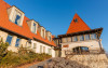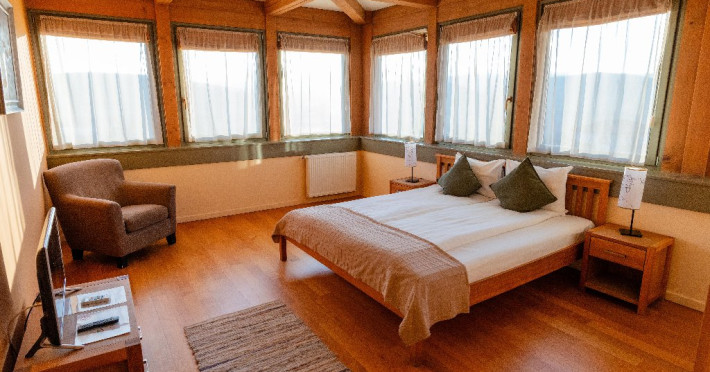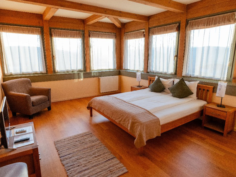 Suita (Turn): este formata din doua camere gemene, care comunica intre ele printr-o usa izolata fonic. De aceea este cazarea ideala pentru familii cu copii. In aceste doua camere totul este dominat de geamurile insirate pe cele trei laturi ale camerei. Aici ai impresia ca exteriorul si interiorul formeaza un intreg. Doar din suita ai posibilitatea sa urci oricand in palaria turnului, in punctul cel mai de sus al pensiunii, unde te primeste un cuib de relaxare cu o panorama unica. Dotari: televizor full HD, baie proprie cu dus si uscator de par.
