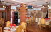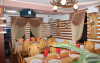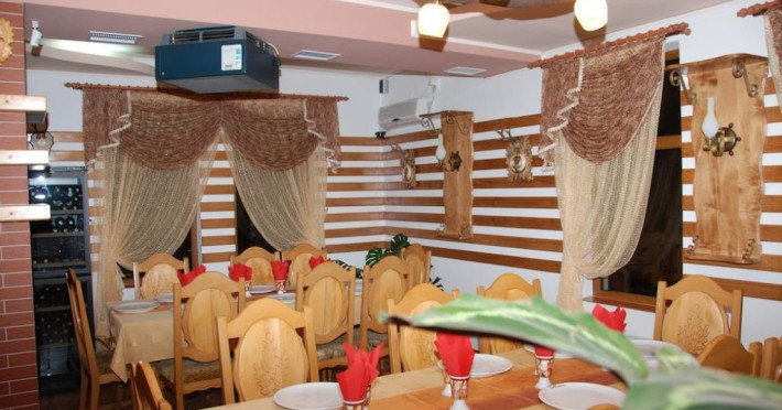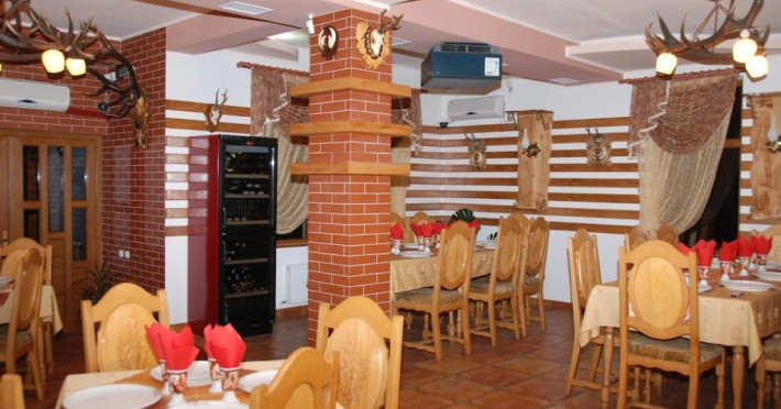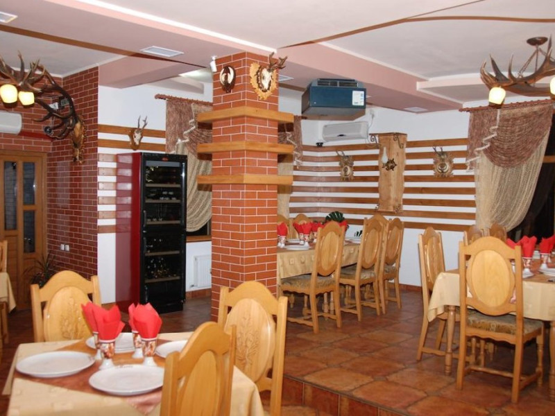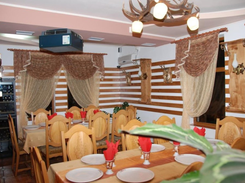 *la parter se afla un restaurant cu 40 de locuri-nefumatori si un altul de 60 locuri pt fumatori, dotate cu aer conditionat, purificator de aer si ventilatie, Lcd si Home Cinema. Bucataria va poate oferi atat meniu clasic cat si bucate traditionale, iar la cerere se poate oferi un bogat festin vanatoresc.