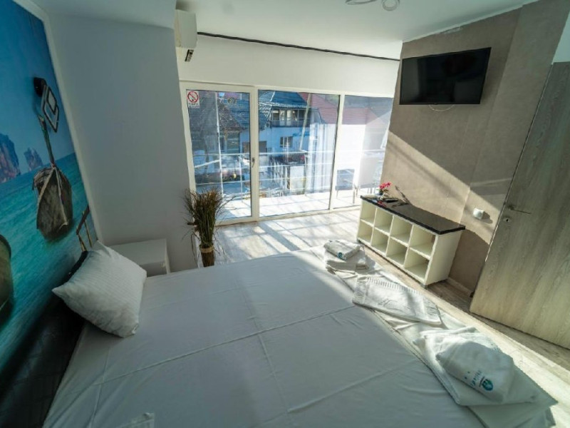 Pensiunea dispune de 17 camere duble si un apartament cu 2 camere, restaurant, sala de evenimente pentru 80 de persoane, piscina cu o capacitate de aproximativ 70 persoane, plimbari cu yacht ul., acces gratuit la internet WiFi in intreaga proprietate.