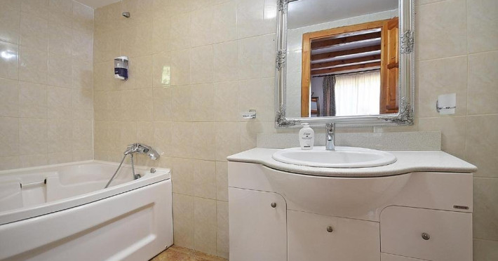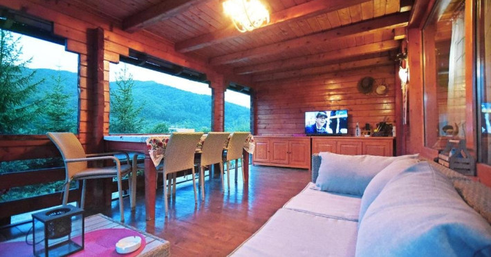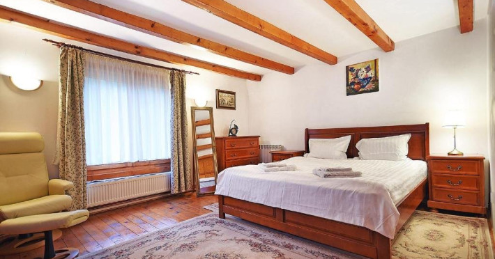 Capacitate de cazare de 7 camere cu paturi matrimoniale, foarte spatioase, dotate cu mobilier din lemn masiv, fiecare cu baie proprie, dressing, uscator par, tv cablu, balcon cu vedere spre padure sau munte. Living-ul, o combinatie de modern si classic, dotat cu semineu, plasma tv, home-cinema si o terasa cu vedere asupra intregii vai. Bucataria este una moderna, echipata cu aparatura necesara.