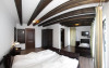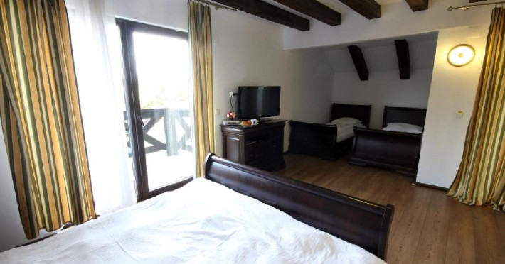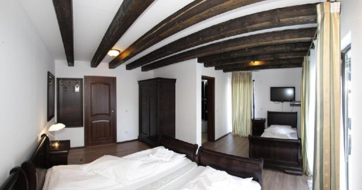 Camera family suite - se preteaza pentru familii cu doi copii, spatioasa, cu patru locuri de cazare, un pat matrimonial si doua paturi single.