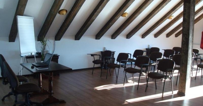 Sala de conferinta aflata la mansarda pensiunii ofera facilitati pentru intalnirile de afaceri, avand o capacitate de maxim 50 de persoane si cu toate dotarile necesare.