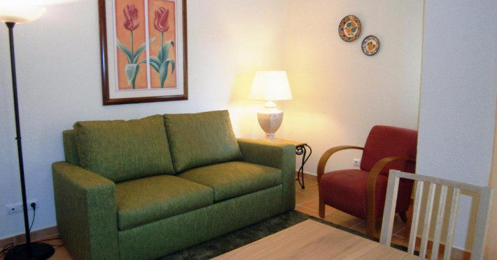 Fiecare unitate de cazare are un lounge amenajat rustic cu o canapea din pluș și mobilier ornat din lemn.