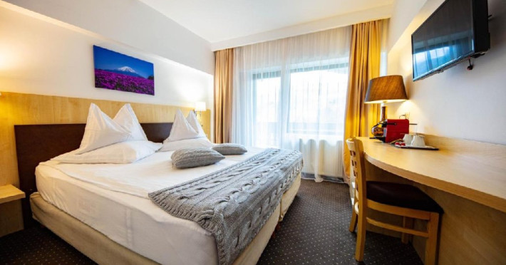 Executive Double Room Upper Floor - Camera spatioasa avand o suprafata de 26 mp, recent renovata, dispune de un pat matrimonial si o canapea extensibila potrivita pentru familiie cu un copil. Aceasta este situata la ultimul etaj.