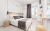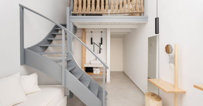Dotate cu mobilier alb, toate studiourile și maisonette-urile de la Petradi Beach au aer condiționat și se deschid spre un balcon mobilat.