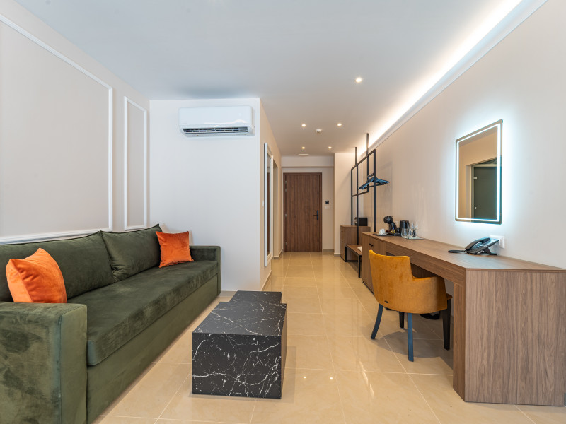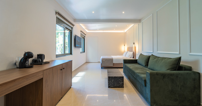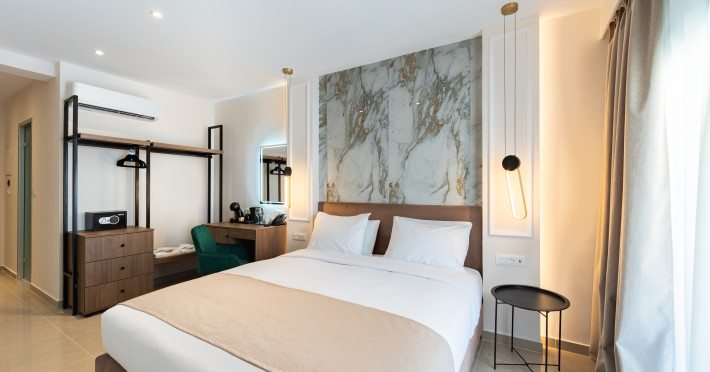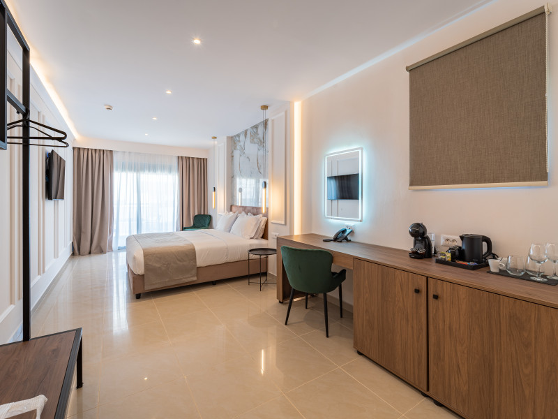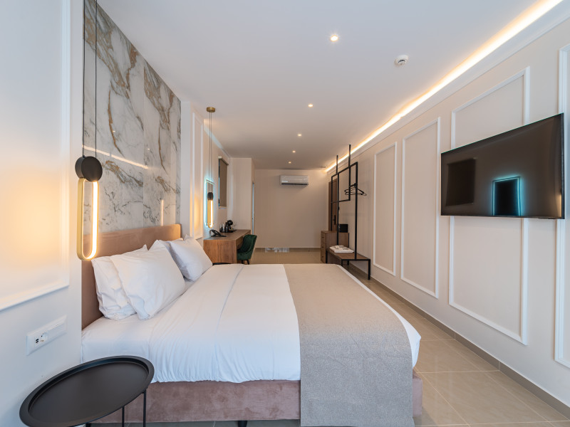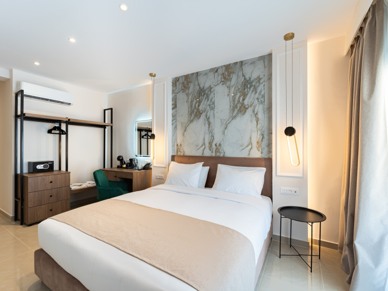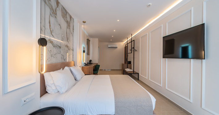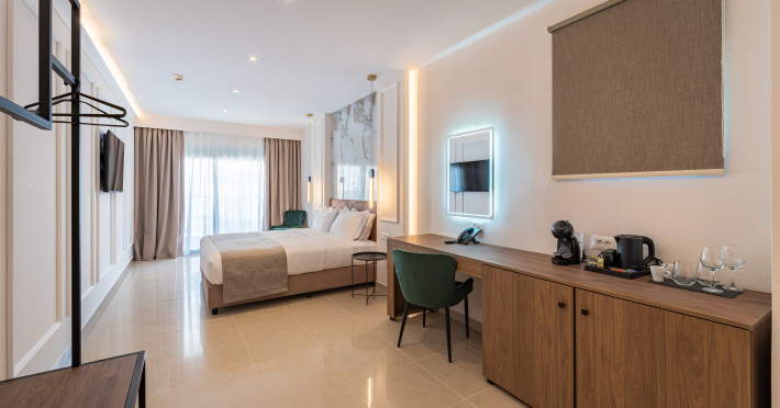 For a truly elevated experience, select one of our exclusive rooftop loft suites, located on the top floor. These luxurious spaces feature private jacuzzis and offer panoramic views of the Aegean Sea, the Medieval Old Town, and the modern cityscape of Rhodes – the perfect backdrop for unforgettable moments.