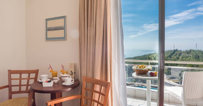 - 88 standard rooms equiped with air conditioning, TV, refrigerator, Wi-Fi, hair dryer and a balcony with panoramic views of the city, the Thermaic Gulf, the forest and the peaks of Mount Olympus.