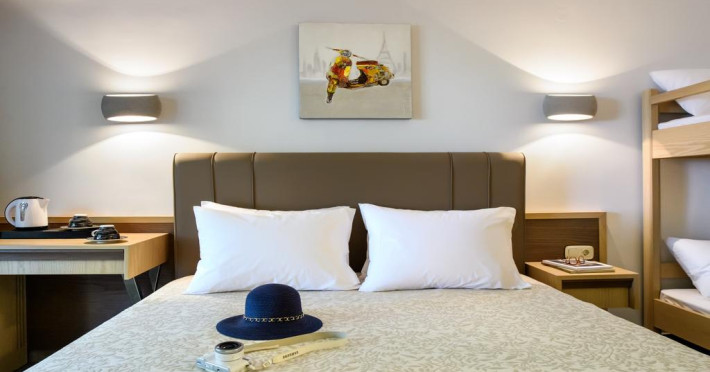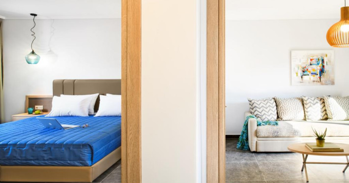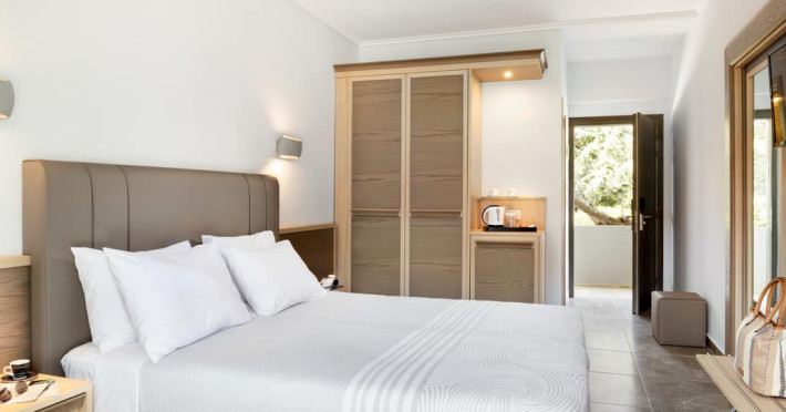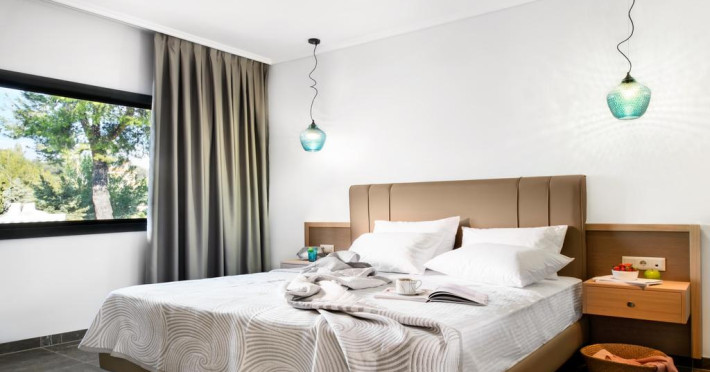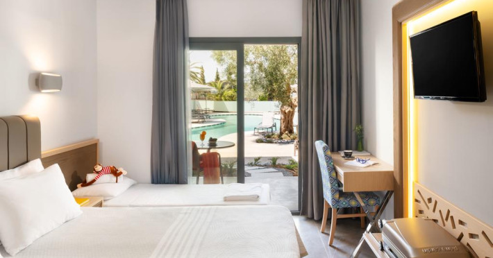 Unele camere au balcon cu vedere la grădină sau la piscină. Fiecare cameră dispune de cană pentru prepararea apei calde. Oaspeții pot solicita serviciul de room service pentru a servi masa sau diverse băuturi. Camerele confortabile de la Philoxenia Hotel au pardoseală de gresie/ marmură, aer condiționat, Tv cu canale prin satelit și seif. În camere există baie cu cadă sau duș prevăzută cu foehn. Curățenia in cameră se face zilnic. Toate camerele spațioase de la Philoxenia Hotel au zonă de relaxare cu canapea, ceea ce oferă un plus de confort. Fiecare unitate de cazare are frigider. Proprietatea oferă camere pentru familie cu o suprafață mai mare și un număr mai mare de paturi față de cele standard. Se pot rezerva de asemenea camere pentru nefumători.