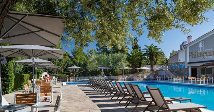 Enchanting place, with golden sandy beaches and crystal clear waters, seems like a paradise. A place where the scent of pine trees prevails and a purple coloured sky promises you dreamy sunrises and romantic sunsets. Magical nights with millions of stars embroidered in the serene sky of Halkidiki. At the beginning of the second peninsula of Sithonia, in the settlement Psakoudia, you are welcomed by the recently renovated 4 star hotel complex PHILOXENIA HOTEL, which promises you unforgettable vacations, unique carefree moments and complete relaxation of the soul and body.Full description