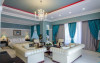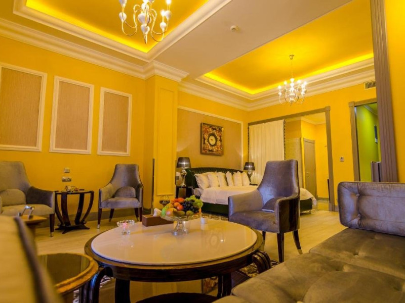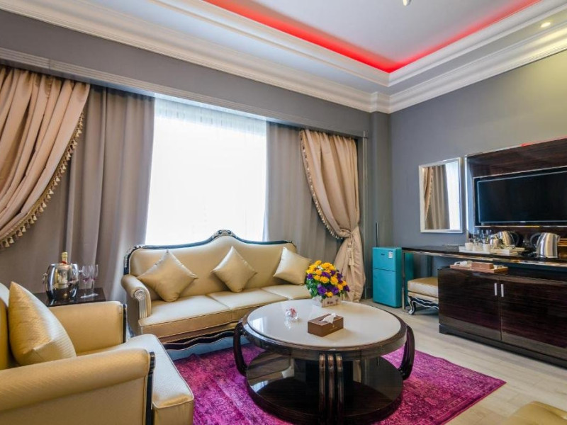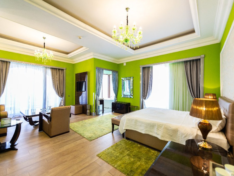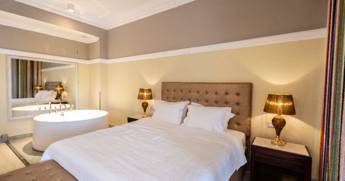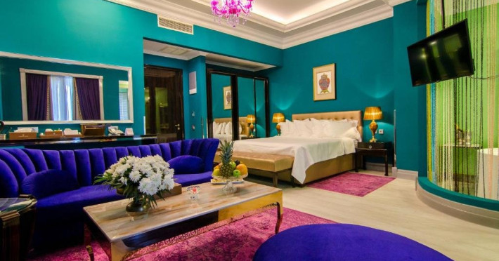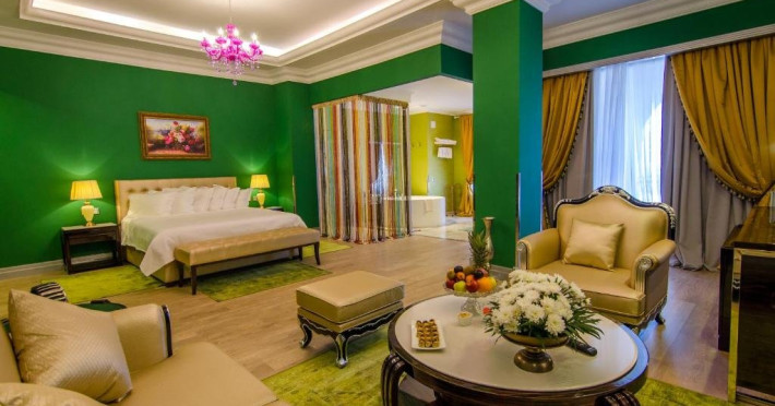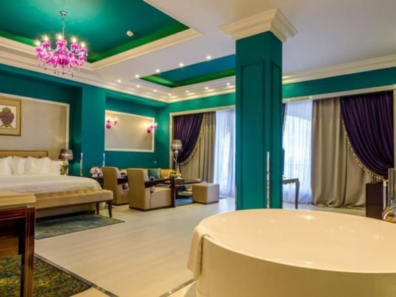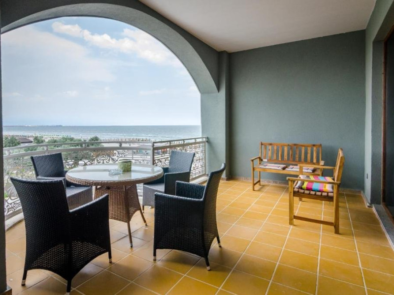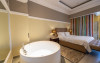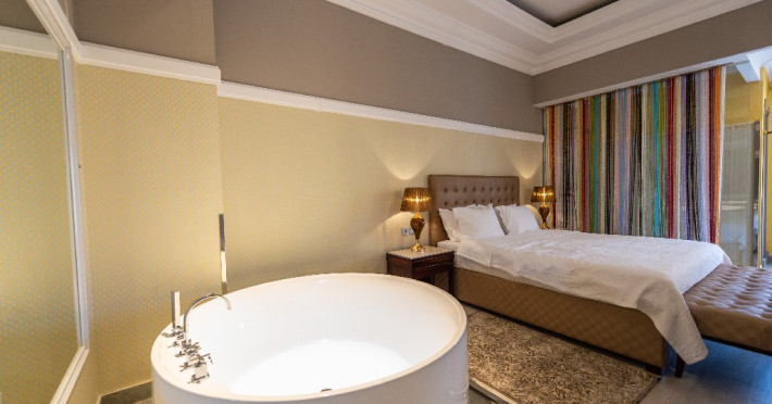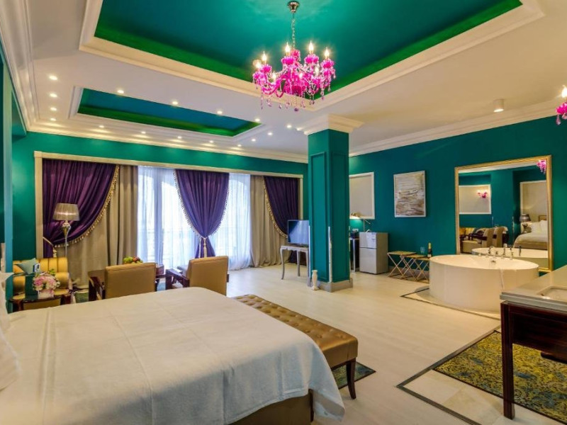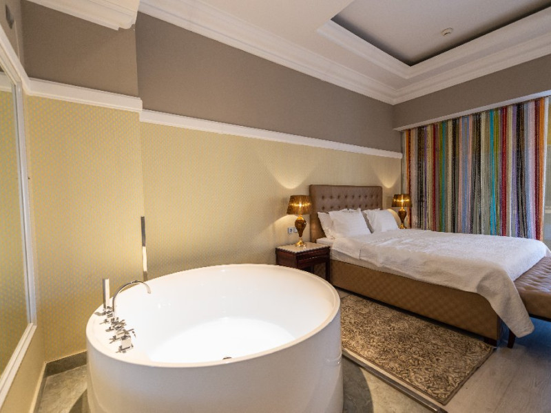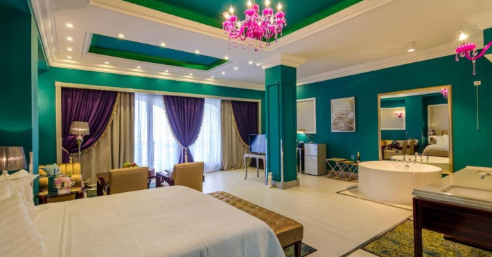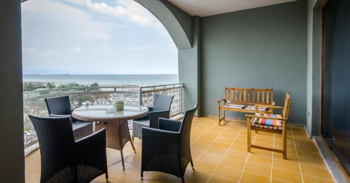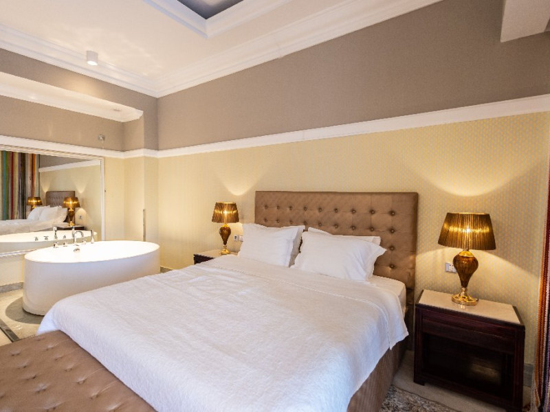 Suita spatioasa, cu dormitor si zona de lounge. Balconul ofera vedere directa la mare, iar mobilierul elegant creeaza un ambient luxos. Include minibar complet, seif, aer conditionat ai o baie mare, dotata atat cu cada, cat si cu dus. Este alegerea perfecta pentru sederi mai lungi sau pentru oaspeti care doresc spatiu si confort suplimentar.