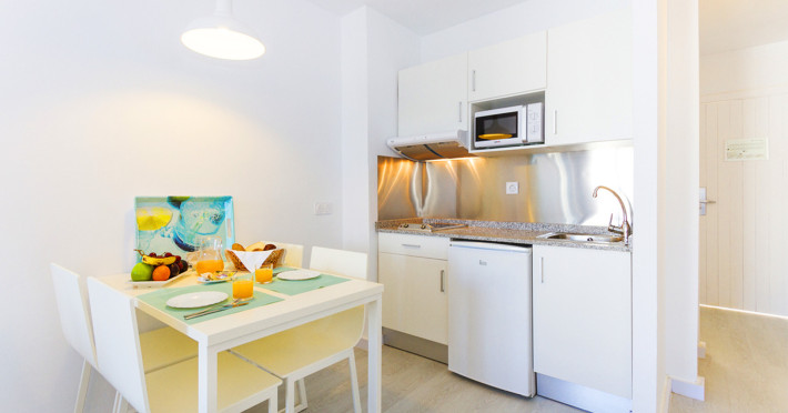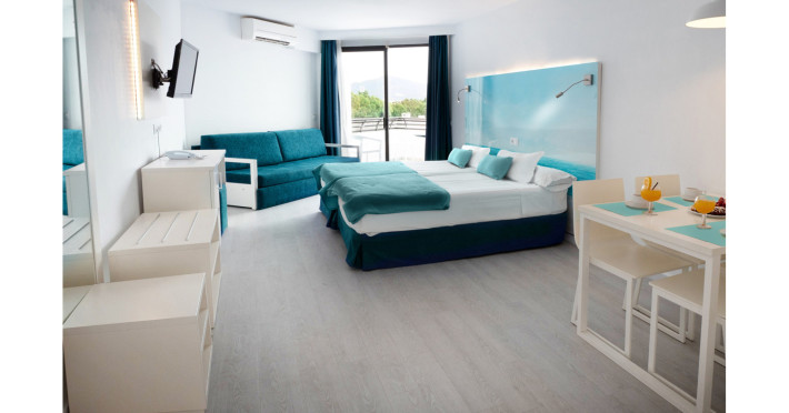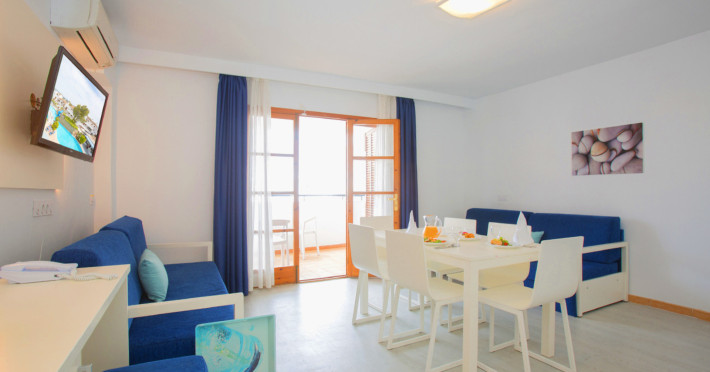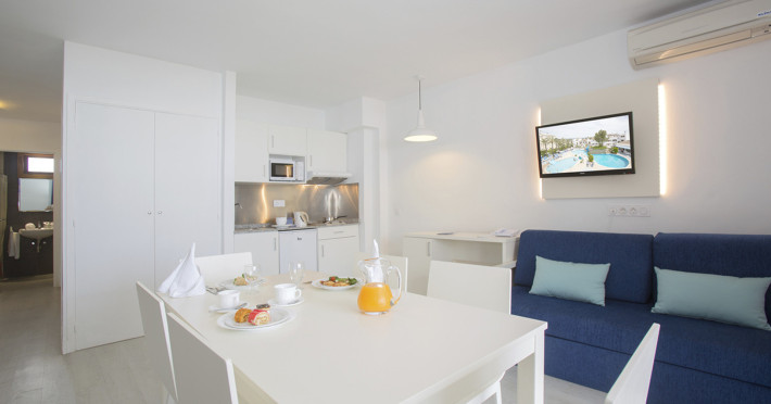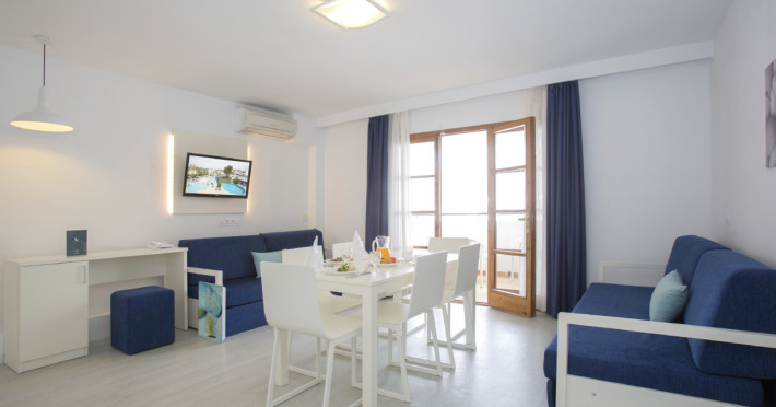 The apart hotel APARTMENTS PLAZAMAR SERENITY RESORT is located approx. 300 m from a sandy beach. In the vicinity a leisure park offers entertainment during the best time of the year. The hotel is equipped with a 24h reception, Wi-Fi, a supermarket, parking spaces as well as a TV lounge. In the outdoor area of the property you will find a seasonally open pool, where sun umbrellas are available for free. There is also a children's pool. Furthermore, outside you can find a terrace. For the smallest children prams can be rented in the hotel. You can store your luggage in the hotel's storage room. To clean your clothes there is a laundry service. If necessary, you can contact the medical centre (for a fee). Guests at the accommodation can get a wake-up call from the hotel personnel. If you want to explore the holiday region, you can use the car and motorbike rental service close to the hotel (extra fee). Catering As catering services the hotel offers all-inclusive. Breakfast is offered from the buffet. Lunch and dinner are also served from the buffet. For the meals, there are a buffet restaurant and the pool bar. Distances- Airport: approx. 30 km