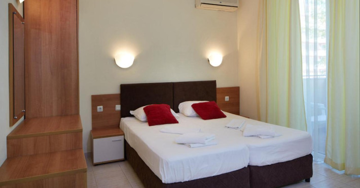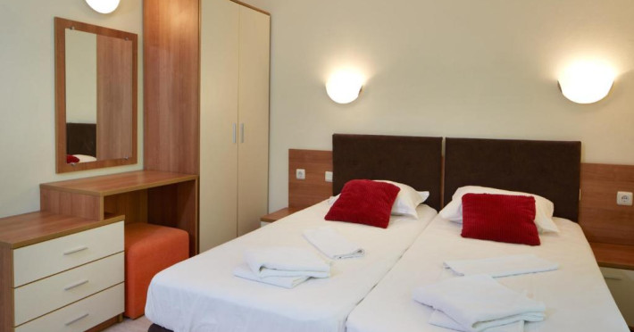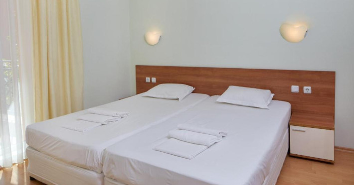 Sunt disponibile 75 camere. Camerele luminoase de la Pollo Resort Aparthotel sunt dotate cu aer condiționat, Tv și seif. În camere există baie cu duș. Oaspeții au acces gratuit la serviciul Wi-fi în camere. Curățenia in cameră se face zilnic. Fiecare unitate de cazare include o chicinetă utilată cu frigider, plită de gătit și ustensile de bucătărie. Proprietatea oferă camere pentru familie cu o suprafață mai mare și un număr mai mare de paturi față de cele standard.