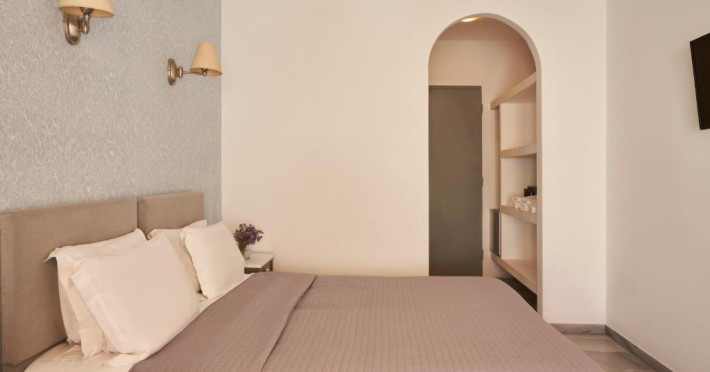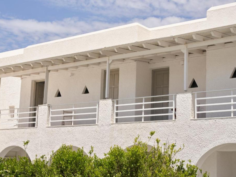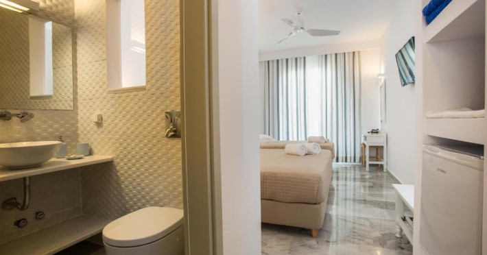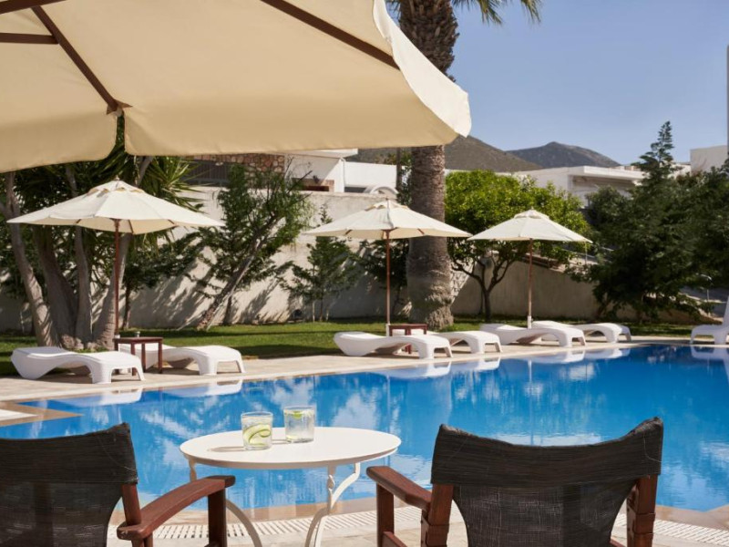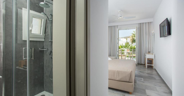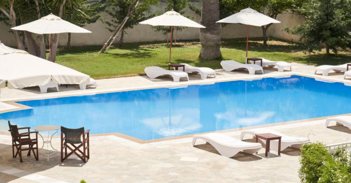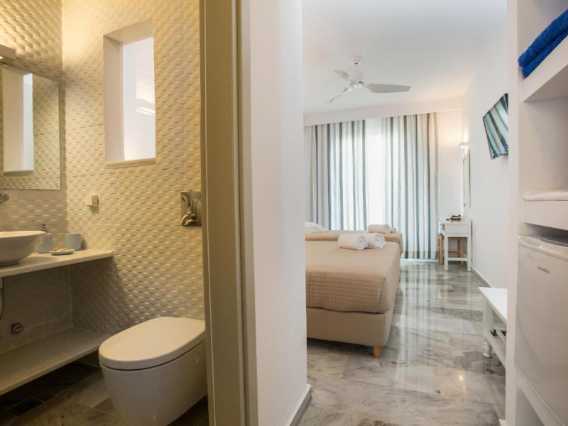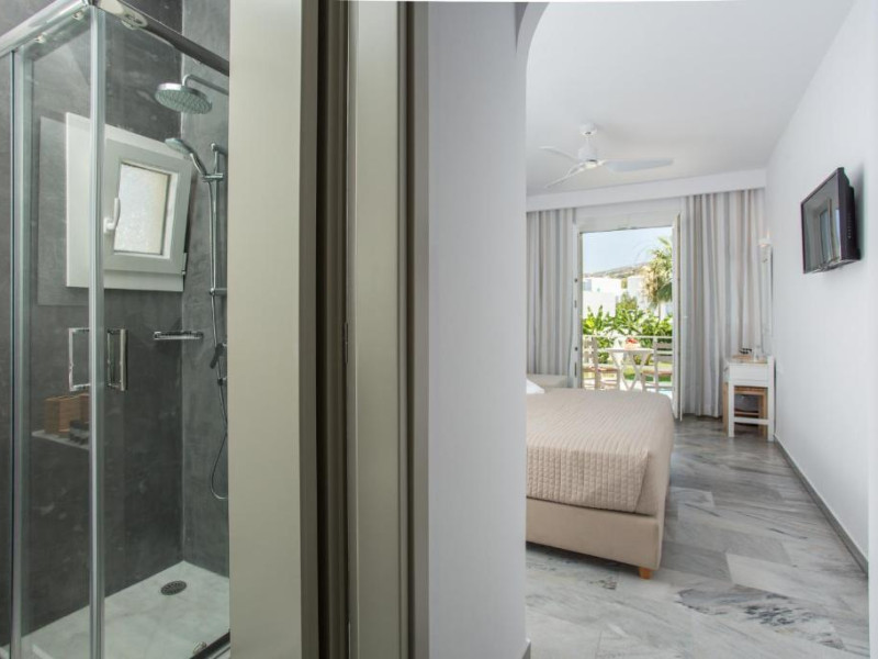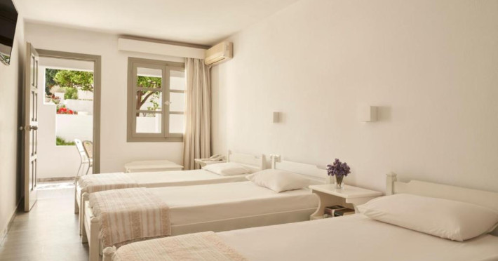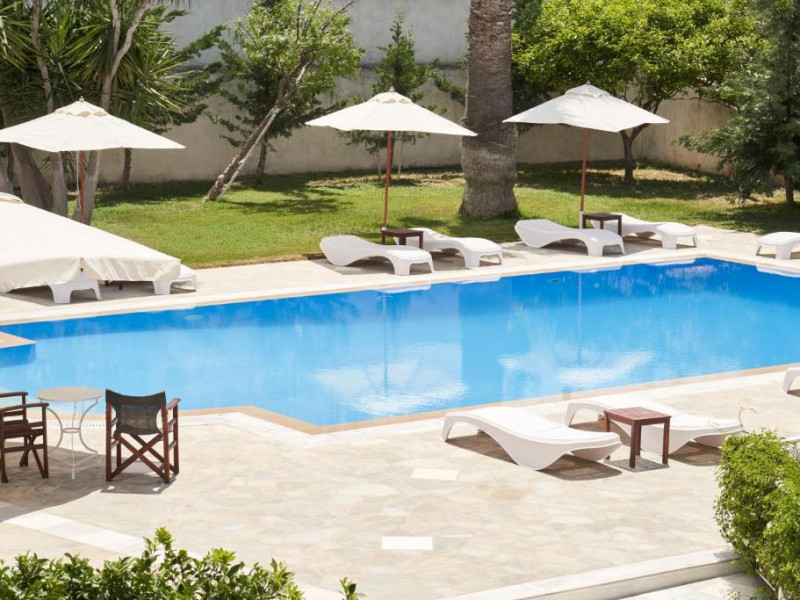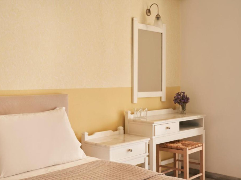 Camerele luminoase sunt decorate in nuanțe mediteraneene și sunt dotate cu balcon sau terasă, aer condiționat, TV prin satelit și mini-frigider. Oaspeții se pot bucura de micul dejun servit langă piscină, intr-o atmosferă relaxantă specifică insulelor grecești.