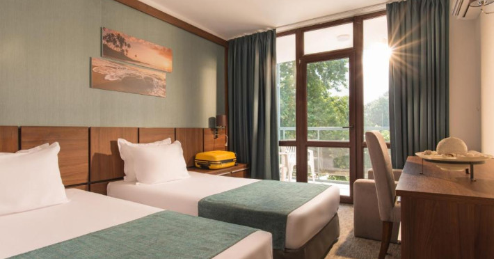 În camere există baie cu duș. Unele camere au balcon, cu vedere la piscină, unde oaspeții se pot relaxa în voie. Camerele luminoase de la Pomorie Sun sunt dotate cu mochetă, aer condiționat, Tv și seif. Oaspeții au acces la serviciul Wi-fi în camere contra cost. Curățenia in cameră se face zilnic. Proprietatea oferă camere pentru familie cu o suprafață mai mare și un număr mai mare de paturi față de cele standard. Se pot rezerva de asemenea camere pentru nefumători.