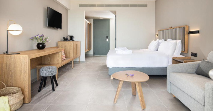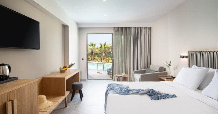 Sunt disponibile 130 camere. Camerele au balcon cu masă și scaune unde pot fi petrecute momente de relaxare. În camere există baie cu cadă sau duș ce are în dotare foehn și articole de toaletă gratuite. Camerele luminoase de la Portes Lithos Luxury Resort sunt dotate cu aer condiționat și Tv cu canale prin satelit. Oaspeții au la dispoziție serviciul de room service pentru a servi masa sau diverse băuturi. Oaspeții au acces gratuit la serviciul Wi-fi în camere. Curățenia in cameră se face zilnic. Proprietatea oferă camere pentru familie cu o suprafață mai mare și un număr mai mare de paturi față de cele standard.