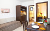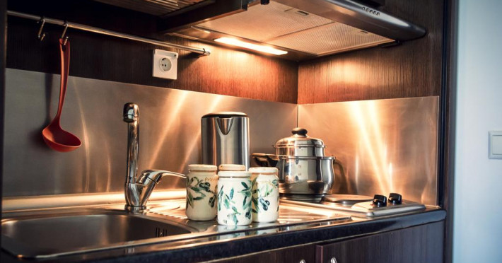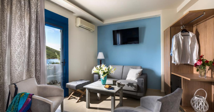 Camerele confortabile de la Porto Koufo au pardoseală de gresie/ marmură, aer condiționat, Tv cu canale prin satelit și seif. Fiecare cameră dispune de minibar și cană-fierbător. Oaspeții pot solicita serviciul de room service pentru a servi masa sau diverse băuturi. Oaspeții au acces gratuit la serviciul Wi-fi în camere. În camere există baie cu cadă sau duș ce are în dotare foehn și articole de toaletă gratuite. Camerele au balcon cu vedere la mare sau la munte. Curățenia in cameră se face zilnic. Proprietatea oferă camere pentru familie cu o suprafață mai mare și un număr mai mare de paturi față de cele standard.