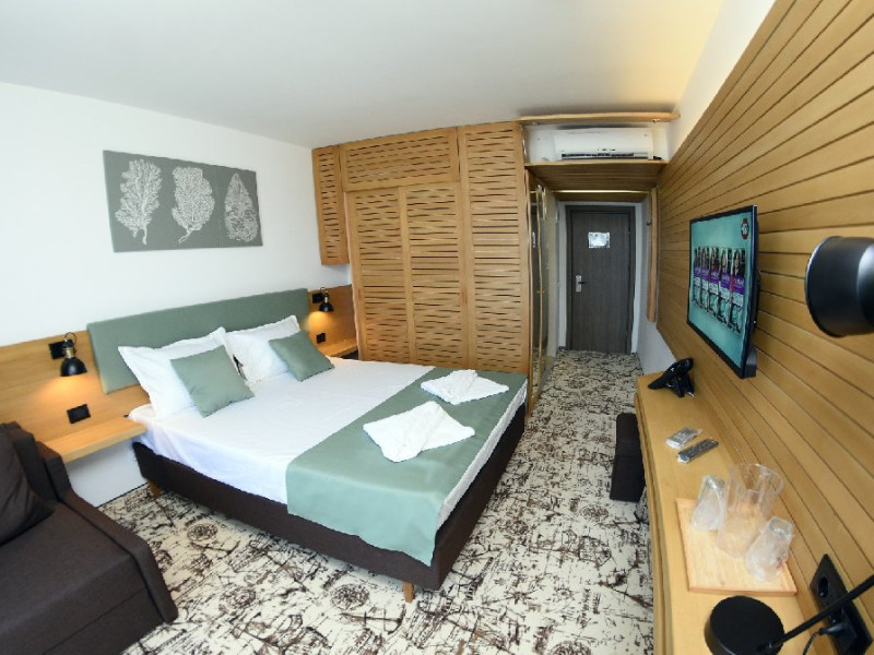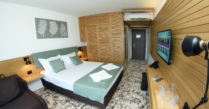 Camere duble Seaview, cu o suprafata de aproximativ 19 mp, au vedere laterala la mare din balcon, pat matrimonial de 160x200 cm, baie proprie cu dus, TV, telefon direct, internet, minibar, aer conditionat, balcon.