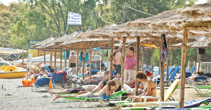 Pe plajă există șezlonguri și umbrele de plajă contra cost.