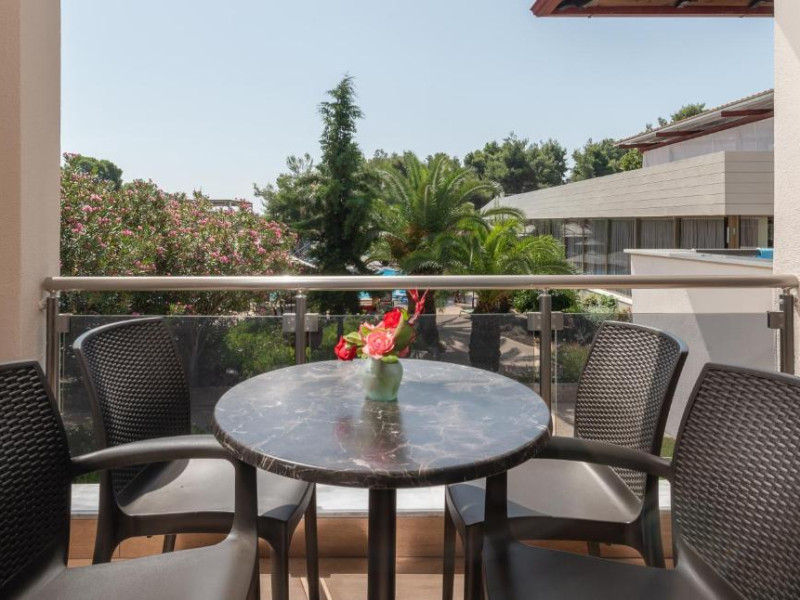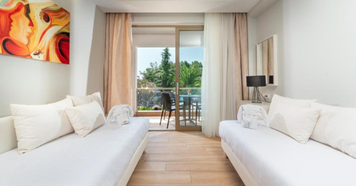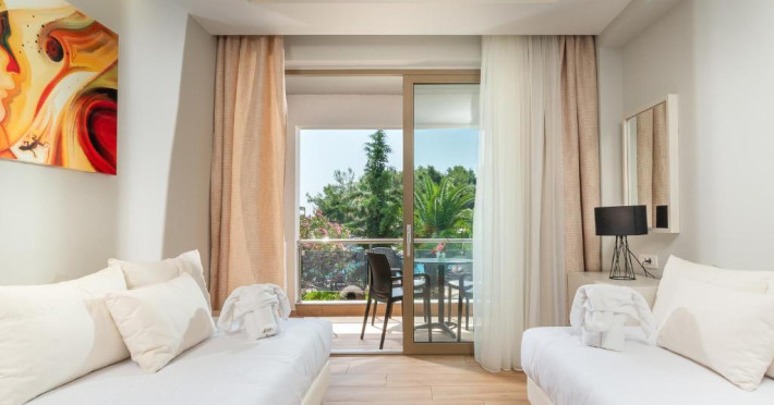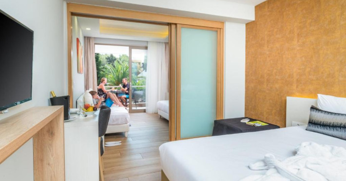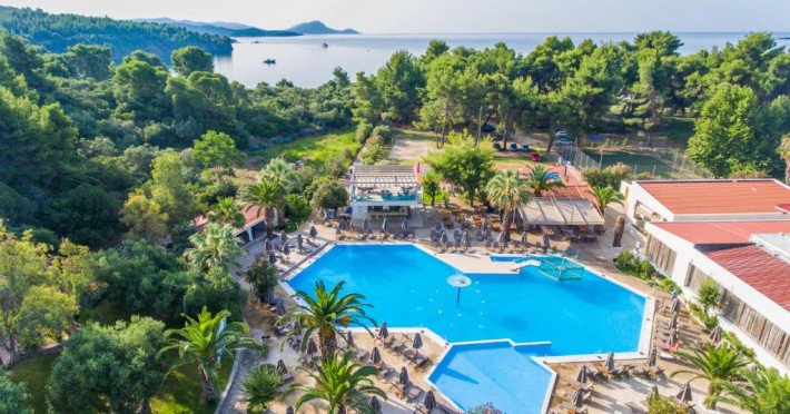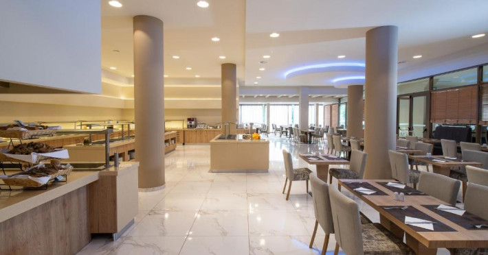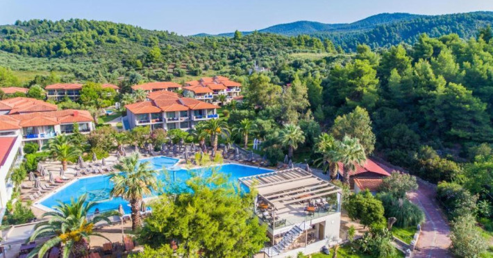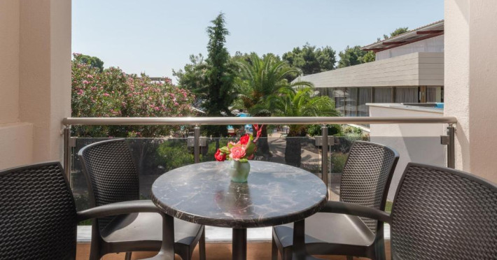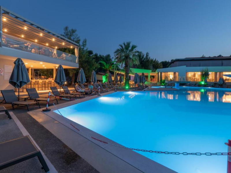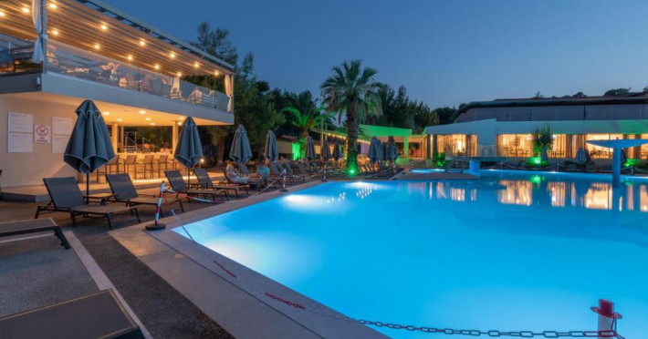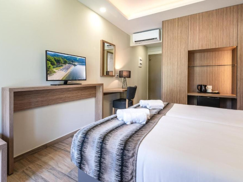 Camerele elegante sunt dotate cu aer condiționat, TV satelit, mini-frigider și balcon cu vedere spre mare sau grădină. Oaspeții se pot bucura de două piscine in aer liber, inconjurate de șezlonguri și umbrele, precum și de un restaurant principal cu preparate grecești și internaționale.