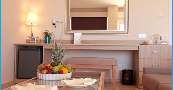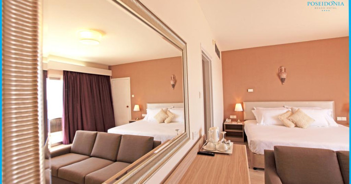 În camere există baie cu cadă sau duș ce are în dotare foehn și articole de toaletă gratuite. Fiecare cameră dispune de minibar și cană-fierbător. Oaspeții pot solicita serviciul de room service pentru a servi masa sau diverse băuturi. Unele camere au balcon cu vedere la mare sau la piscină. Camerele de la Poseidonia Beach Hotel sunt dotate cu aer condiționat, Tv cu canale prin satelit și seif. Oaspeții au acces gratuit la serviciul Wi-fi în camere. Curățenia in cameră se face zilnic. Există unități de cazare are au chicinetă. Proprietatea oferă camere pentru familie cu o suprafață mai mare și un număr mai mare de paturi față de cele standard. Se pot rezerva de asemenea camere pentru nefumători.