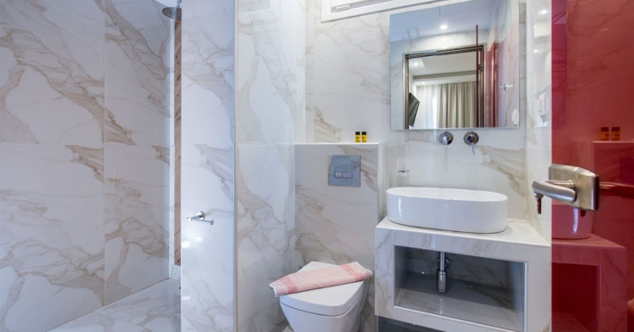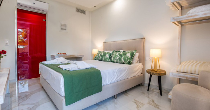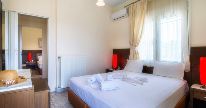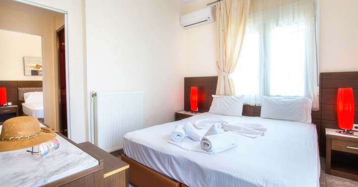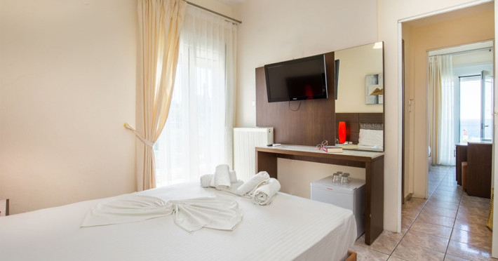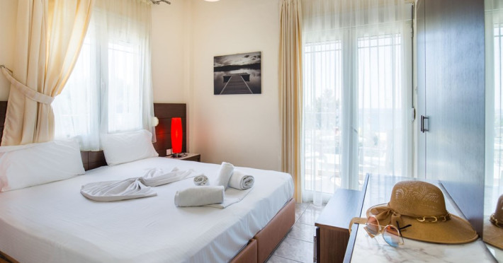 Sunt disponibile 68 camere. Camerele confortabile de la Potos Hotel au pardoseală de gresie/ marmură, aer condiționat, Tv cu canale prin satelit și seif. Unele camere au balcon cu vedere la mare sau la piscină. În camere există baie cu cadă sau duș ce are în dotare foehn și articole de toaletă gratuite. Fiecare cameră dispune de minibar. Oaspeții au acces gratuit la serviciul Wi-fi în camere. Curățenia in cameră se face zilnic. Fiecare unitate de cazare are frigider. De asemenea, este disponibilă o zonă de luat masa. Proprietatea oferă camere pentru familie cu o suprafață mai mare și un număr mai mare de paturi față de cele standard.