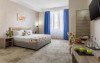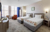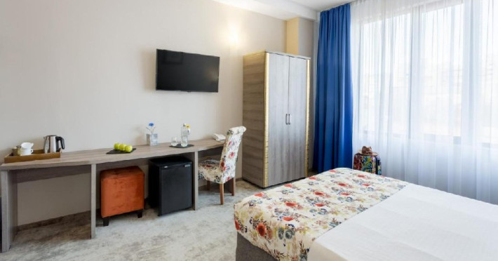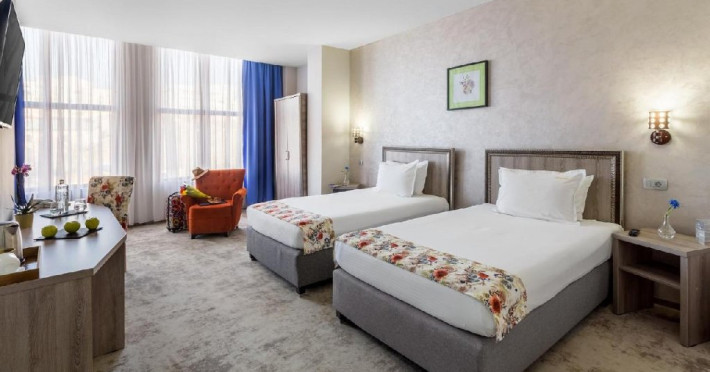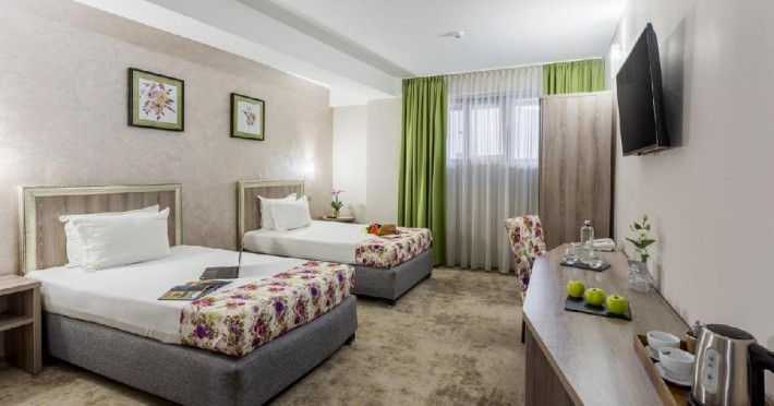 Camera junior suite twin - Cu o capacitate de trei persoane, acest apartament isi intampina oaspetii cu o atmosfera intima si relaxanta. Apartamentul este decorat intr-o maniera simplista, fiind o idee excelenta pentru cazarea a 3 persoane.